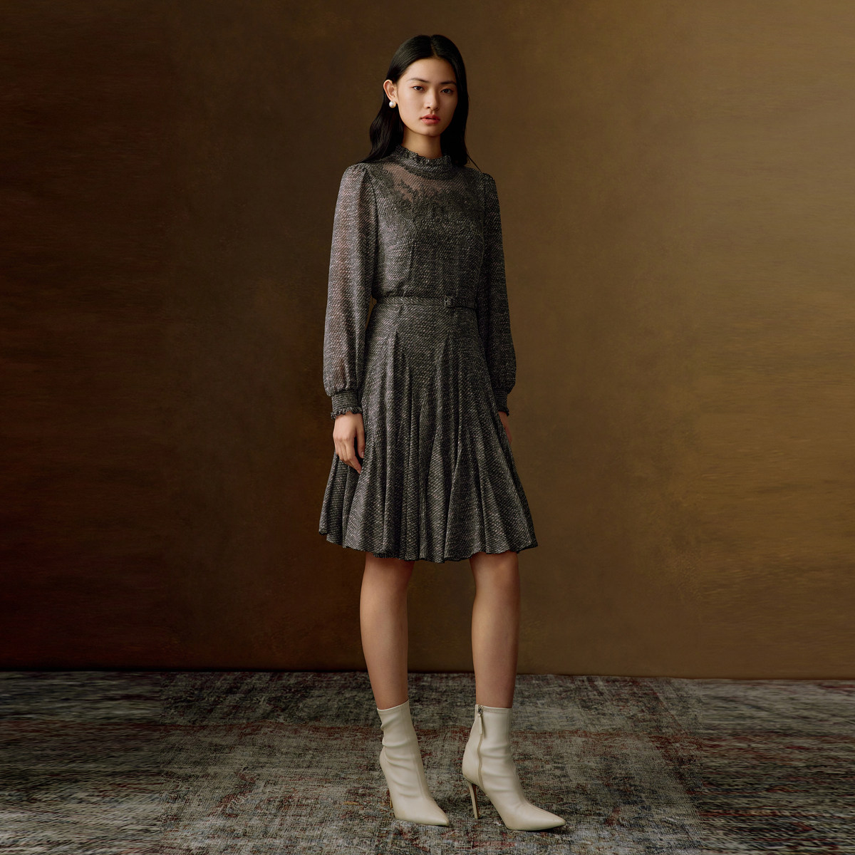 VGRASS维格娜丝秋季12姆米真丝乔其桑蚕丝重工刺绣灵动飘逸连衣裙