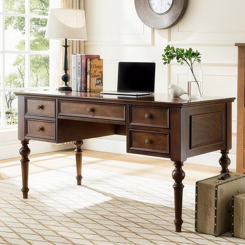 美式乡村全实木书桌台式电脑桌家用办公桌椅组合胡桃色复古写字台
