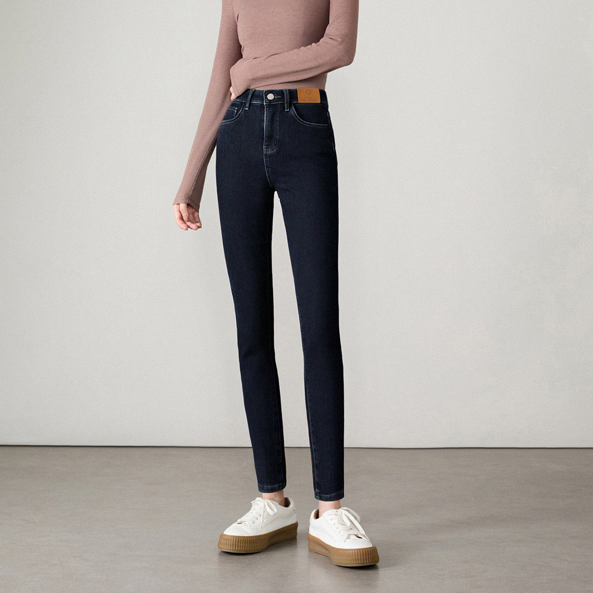 茵曼2025冬季新款美式加绒加厚牛仔裤女士休闲修身铅笔九分小个子