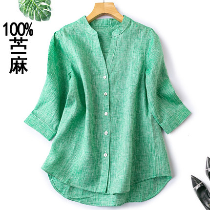 纯亚麻衬衫立领五分袖衬衣 宽松 V领防晒衫小码棉麻女装色织衬衣