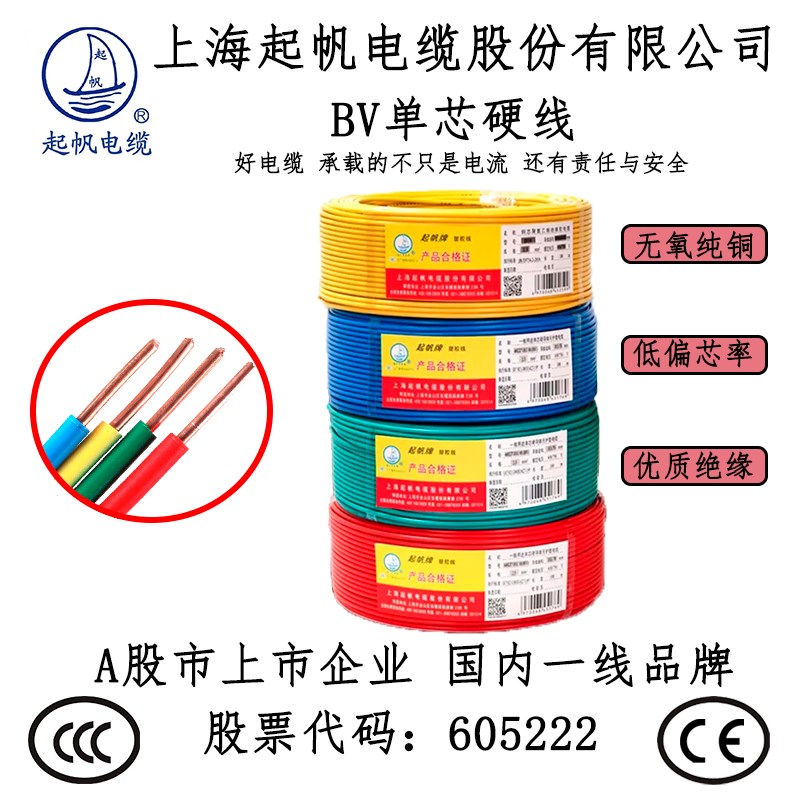 起帆电线BV1.5 2.5 4 6 10平方家用单股硬线铜芯国标单芯100米