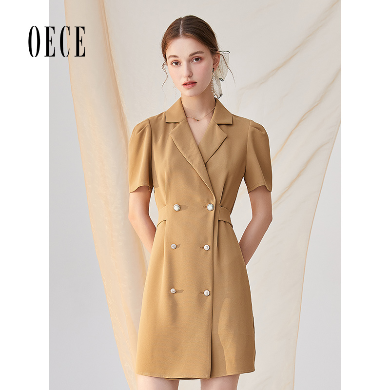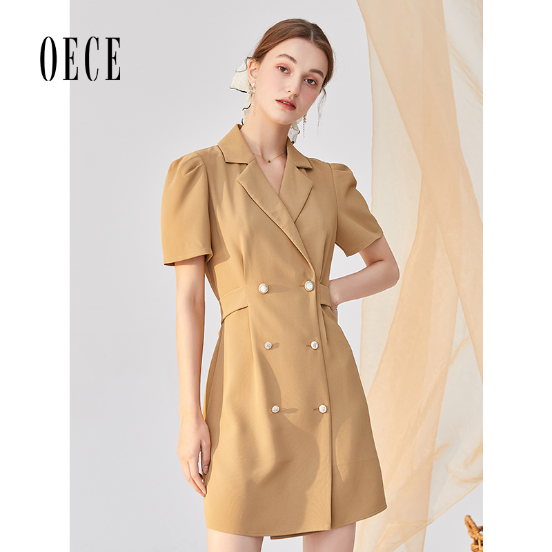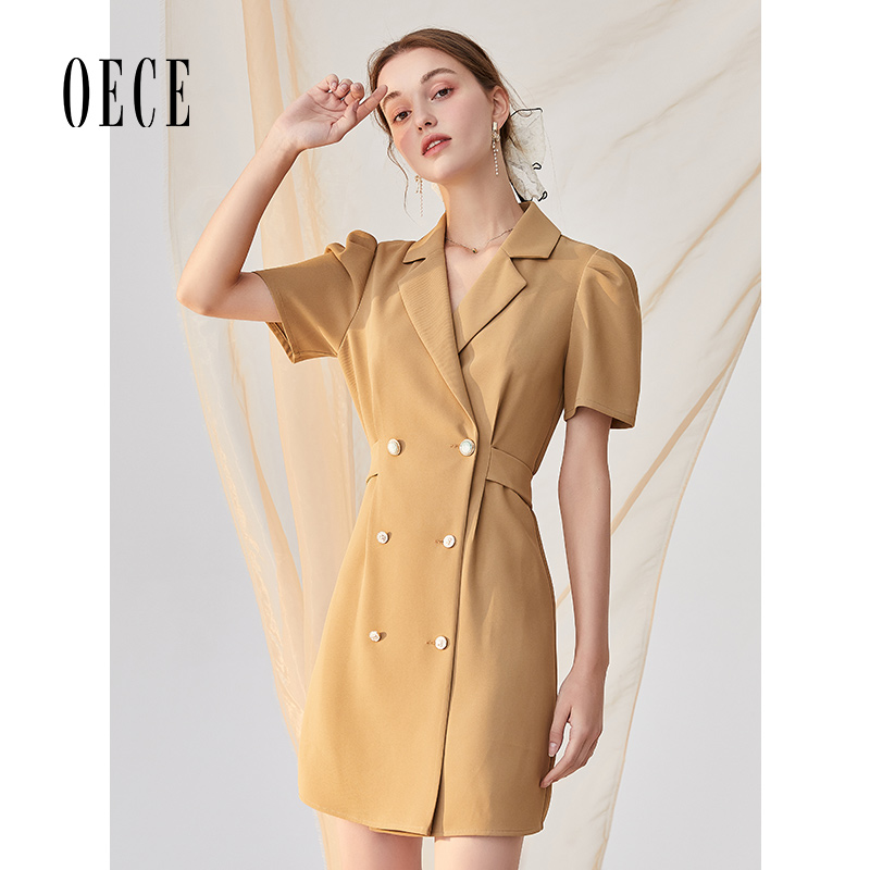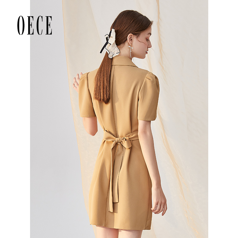 Oece春夏装新款女洋气显瘦复古西装翻领泡泡袖连衣裙