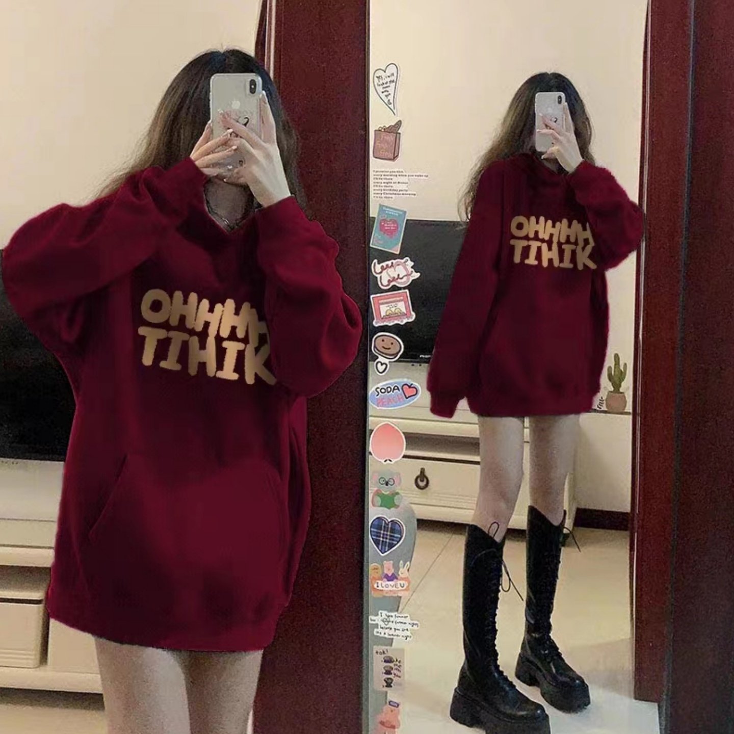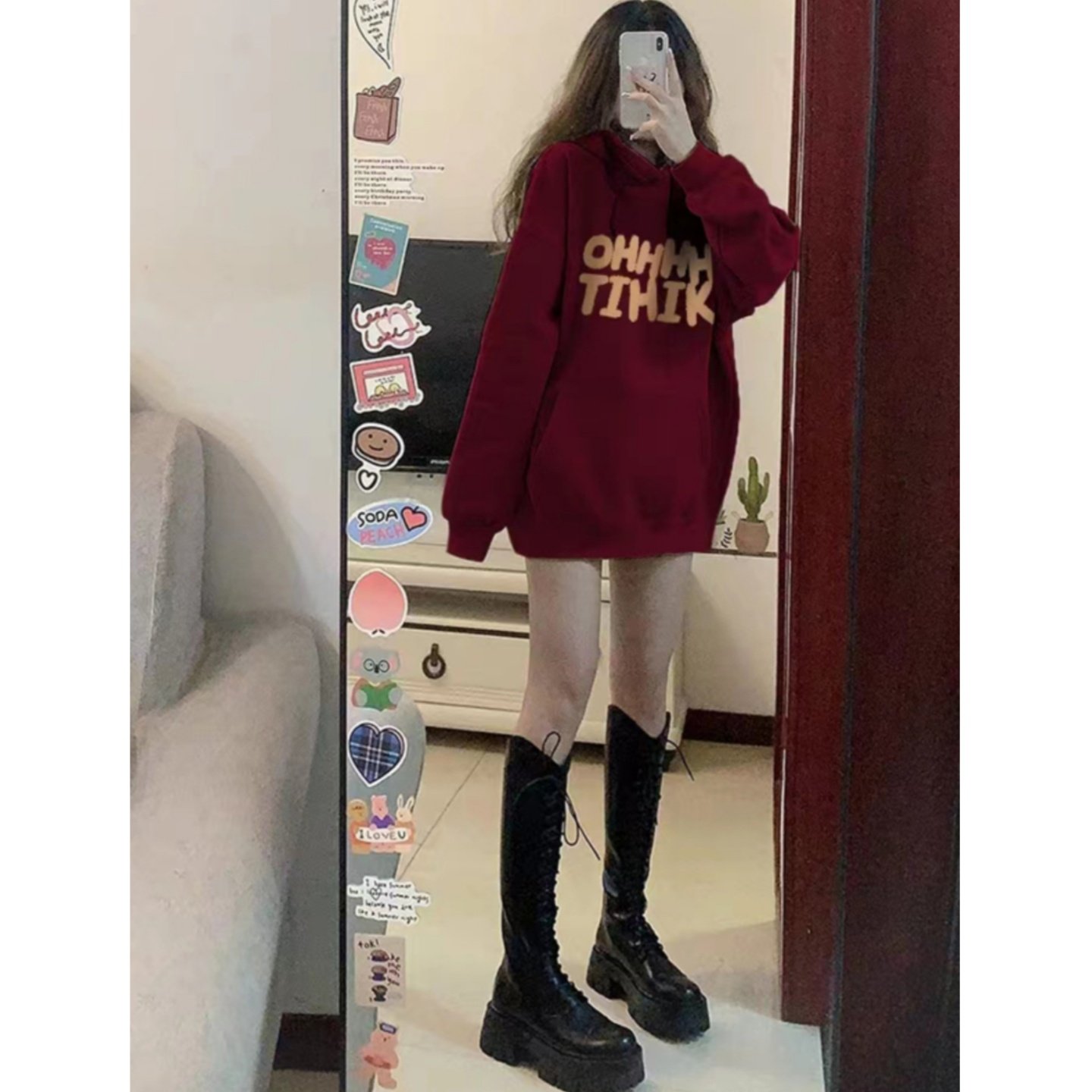 酒红色高级感加绒保暖连帽卫衣女2025新款秋冬季宽松加厚套头上衣