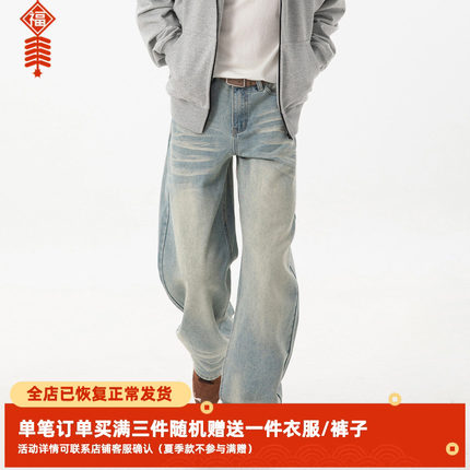 SYP日系不系男生春秋立体猫须水洗美式直筒高街复古宽松牛仔长裤