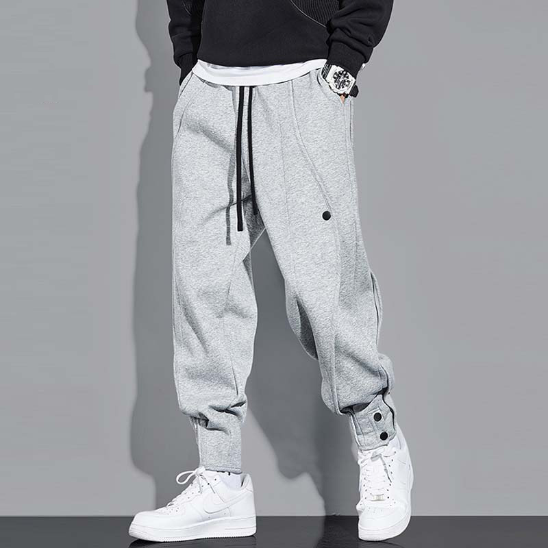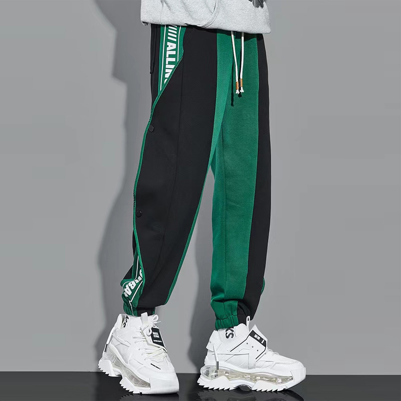 秋季运动休闲裤子男士加大加肥大码宽松拼接裤字母印花排扣束脚裤