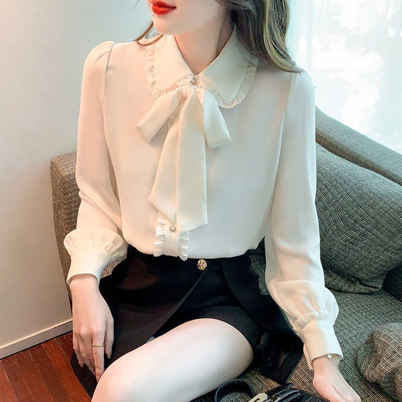 蝴蝶结长袖衬衫女春装新款韩版小众上衣设计感宽松气质雪纺衬衣