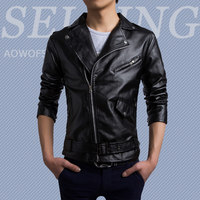 韩版新款个性斜拉链铆钉扣肩章白色PU皮衣紧身男外套机车装皮夹克