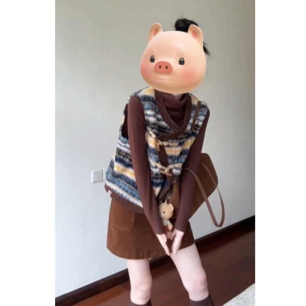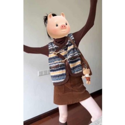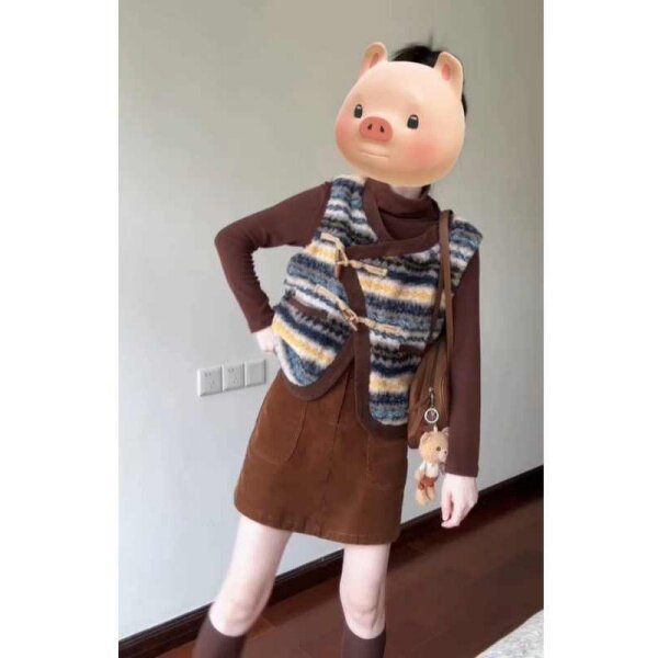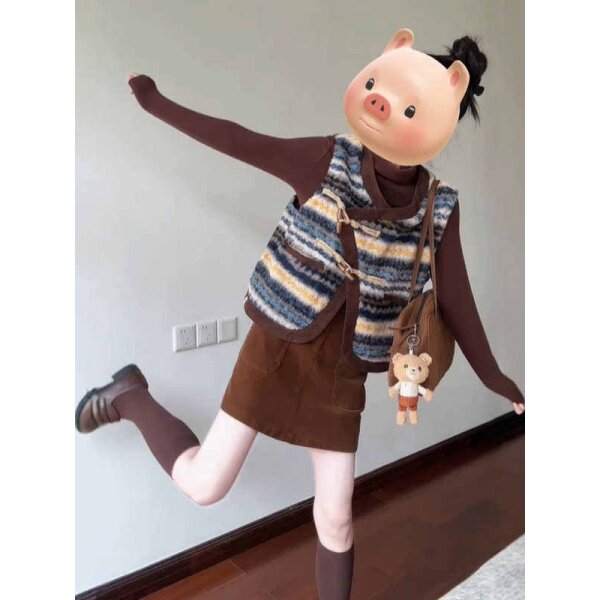 韩系复古撞色条纹马甲打底衫半裙