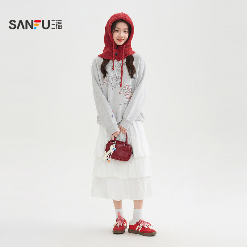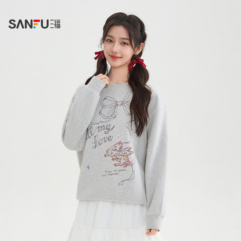 三福灰色卫衣女2026新款春季小马印花加绒宽松无帽上衣女装515590