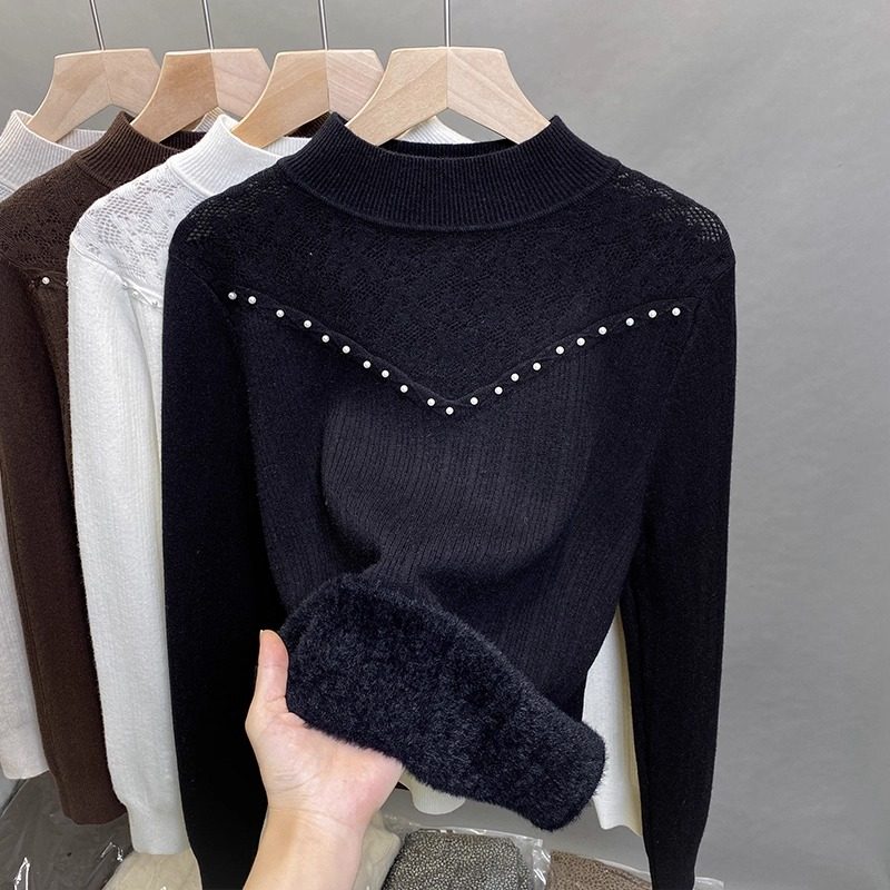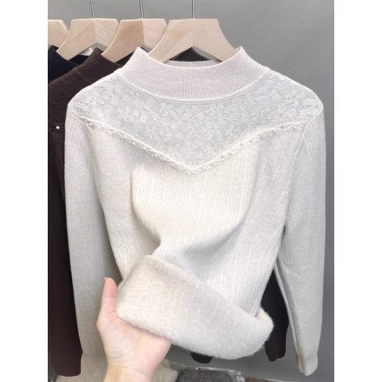 一体绒半高领毛衣女加绒加厚打底衫2025秋冬新款蕾丝针织内搭上衣