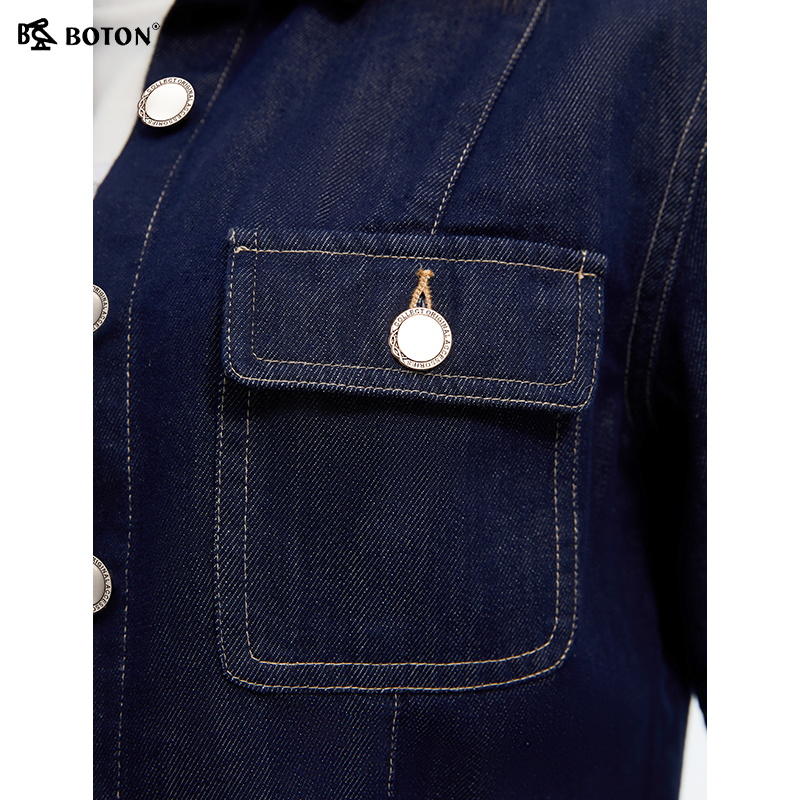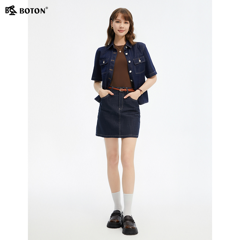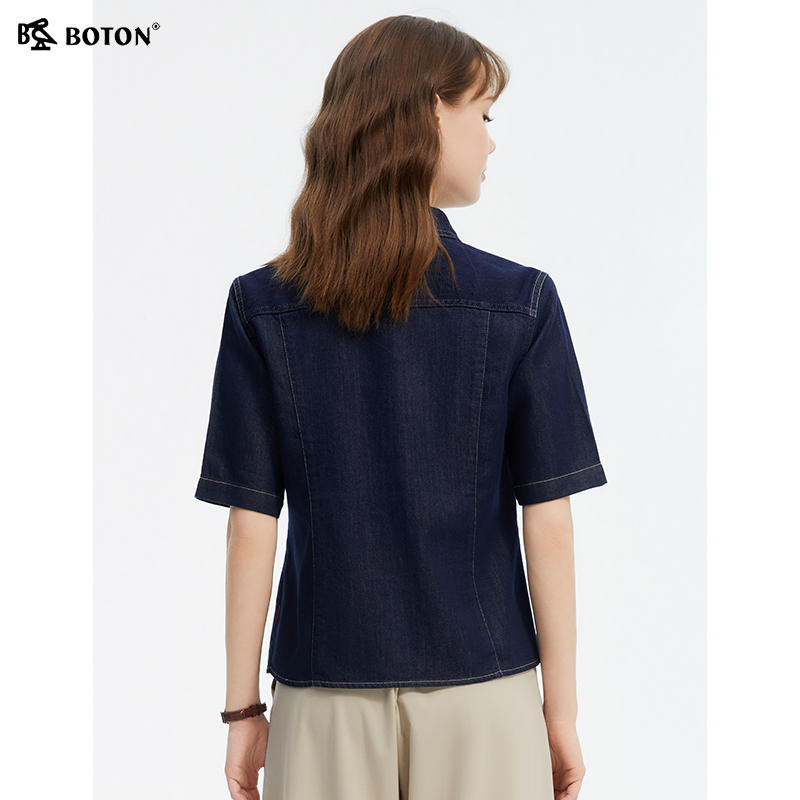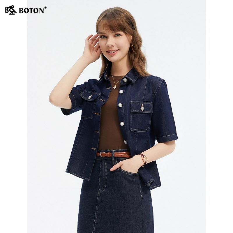 波顿2025年春夏新款女短袖牛仔衬衫口袋高端美式休闲衬衣修身显瘦
