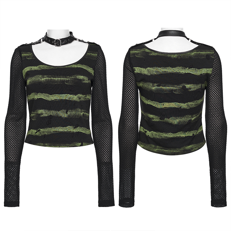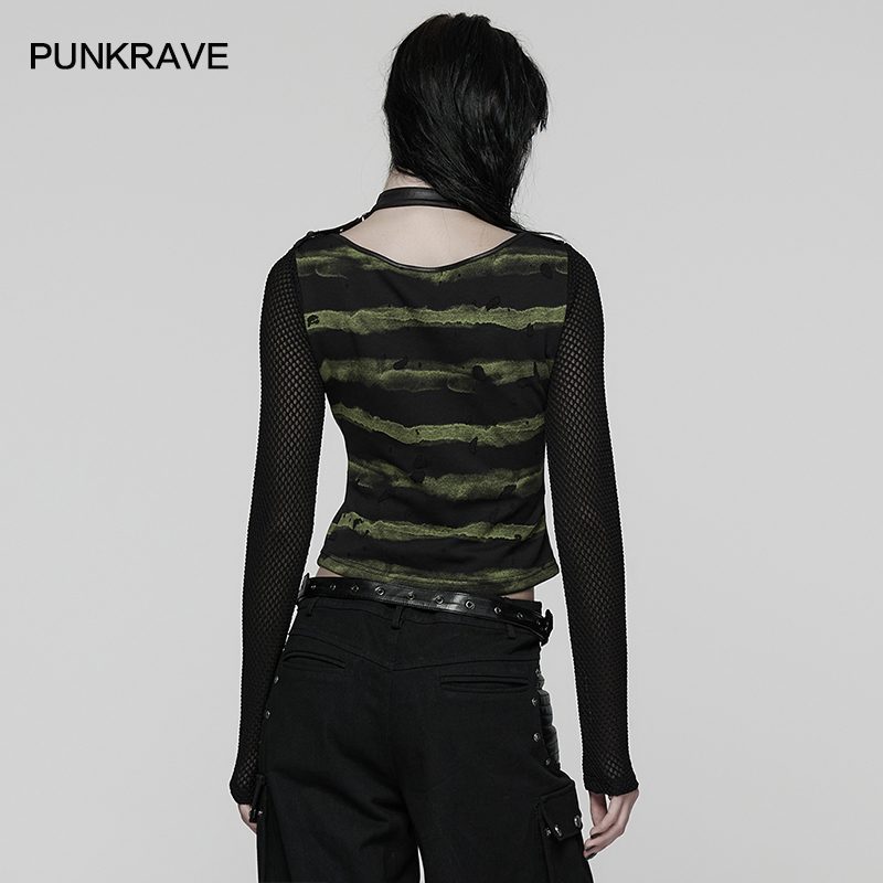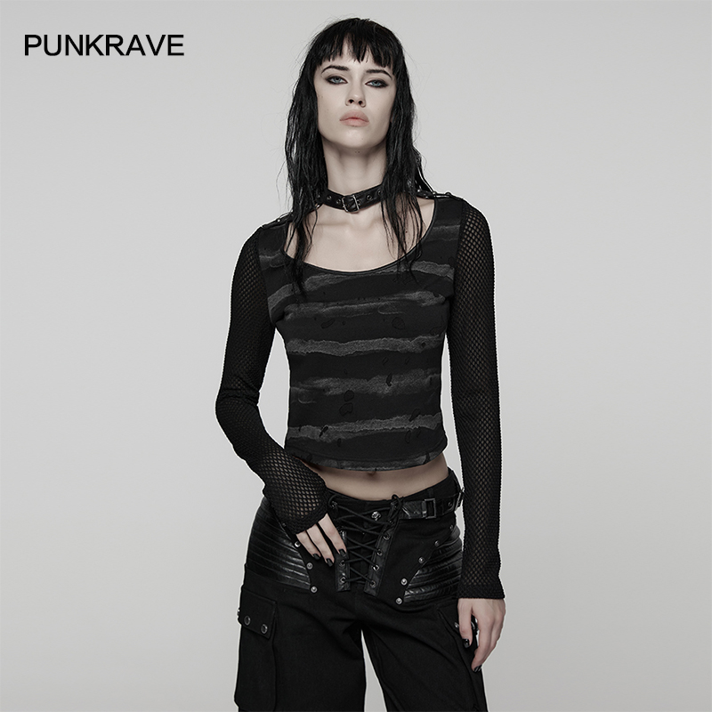 朋克条纹破洞长袖t恤女修身显瘦小众捏褶短款上衣复古镂空针织衫
