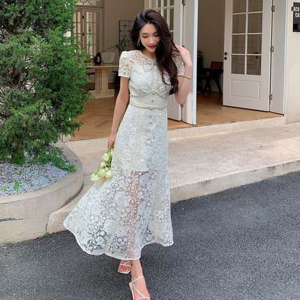 春季新品长款礼服法式复古千金风气质显瘦修身蝴蝶结蕾丝连衣裙女