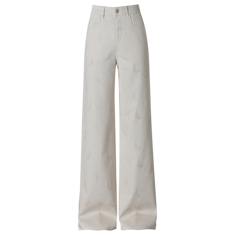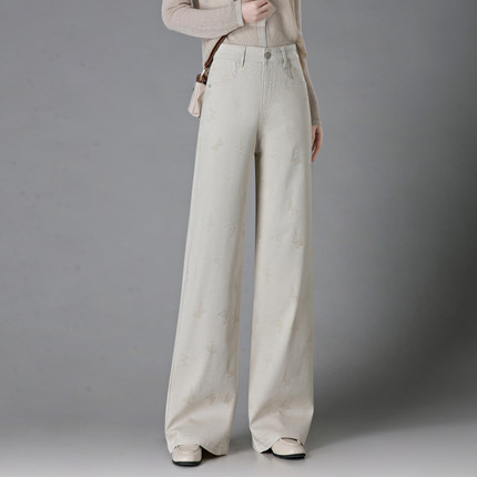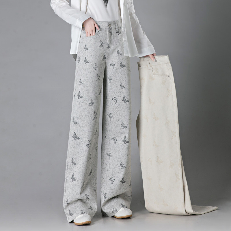梦舒雅印花软牛仔阔腿裤女2026新款高腰显瘦复古垂感窄版直筒裤子
