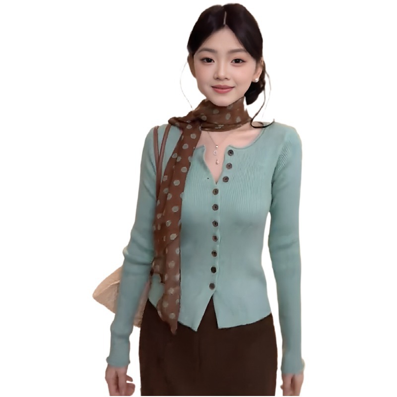 大码韩系薄荷绿纽扣针织衫女秋季胖mm时尚修身上衣开衫绝美打底衫