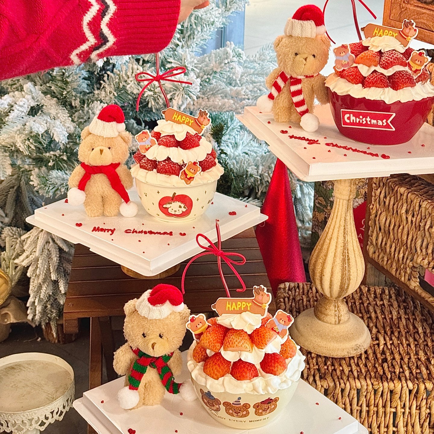 2026圣诞节围巾小熊蛋糕装饰摆件小熊草莓碗陶瓷碗甜品烘焙装扮