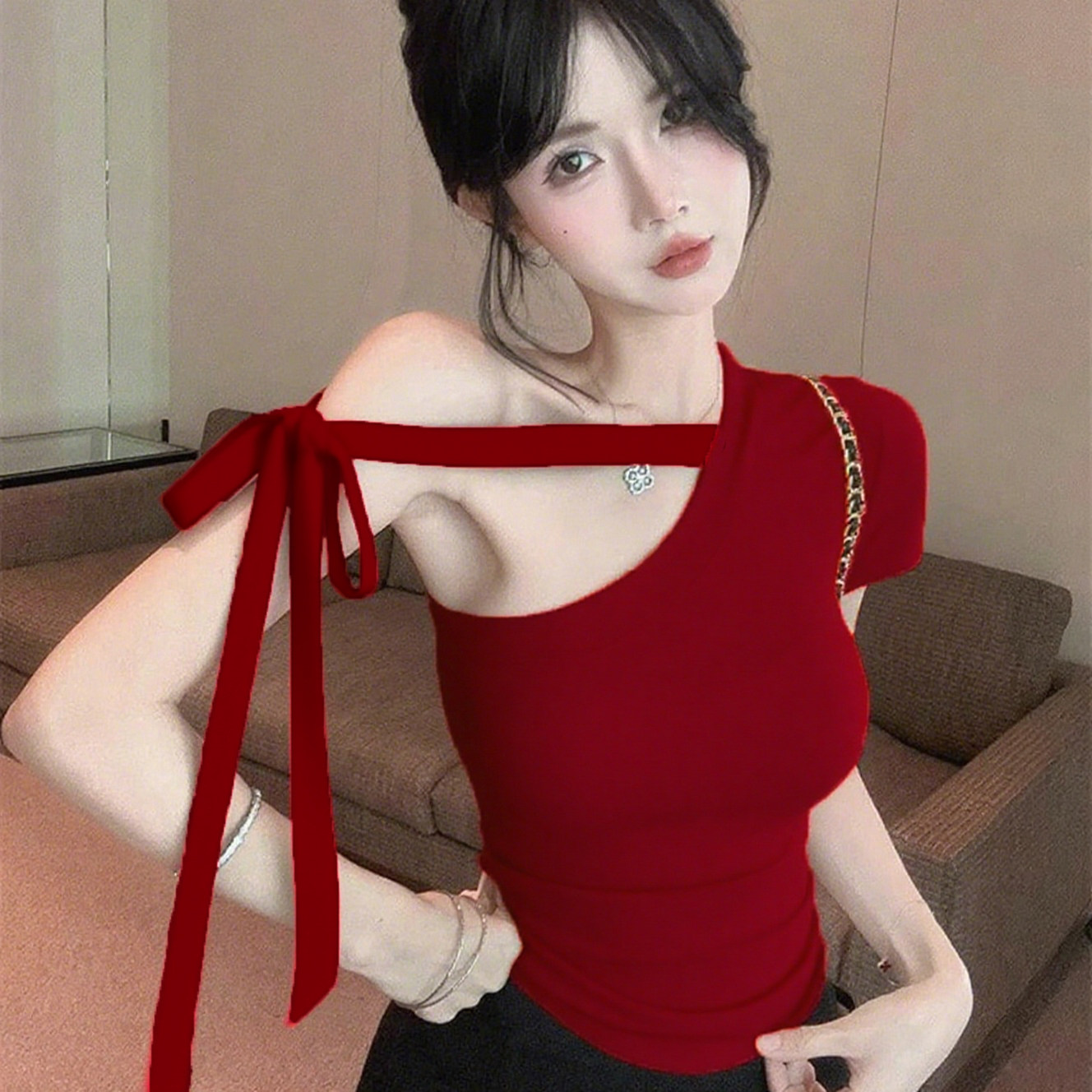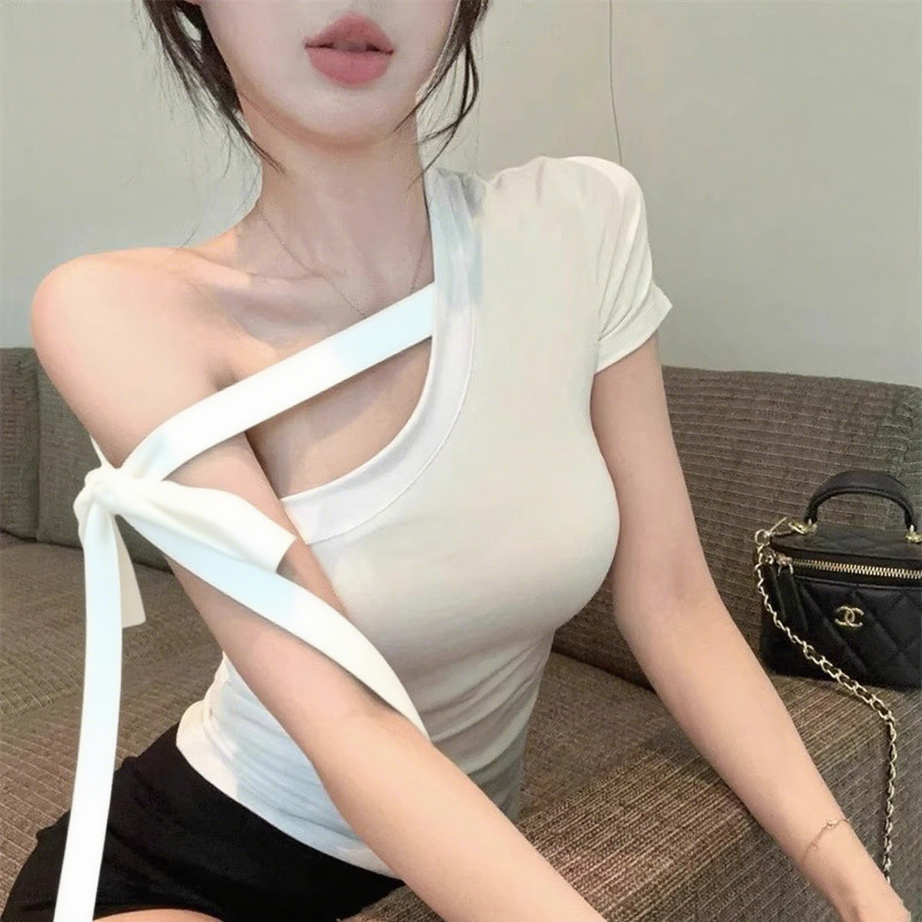 2025新款纯欲性感斜肩短袖T恤女夏季设计感小众绑带辣妹修身短款