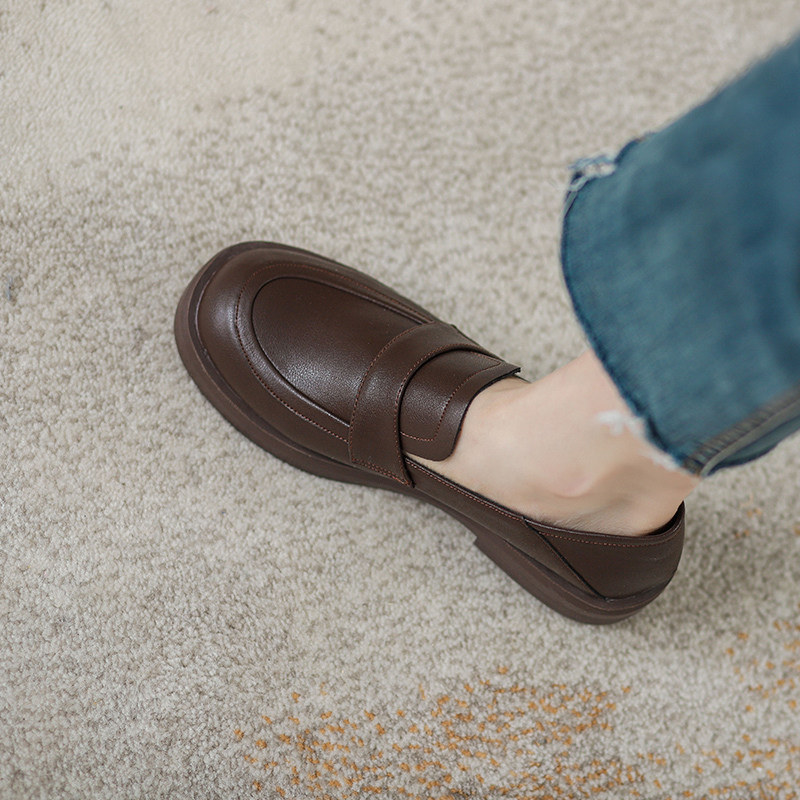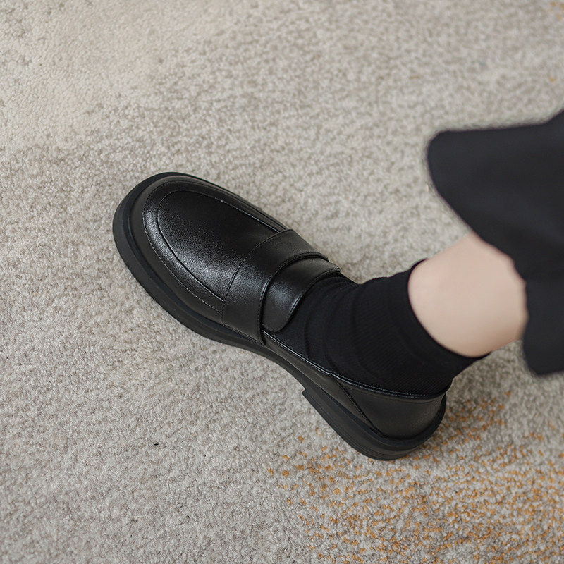 软牛皮乐福鞋女2023秋冬新款百搭平底单鞋一脚蹬黑色英伦风小皮鞋