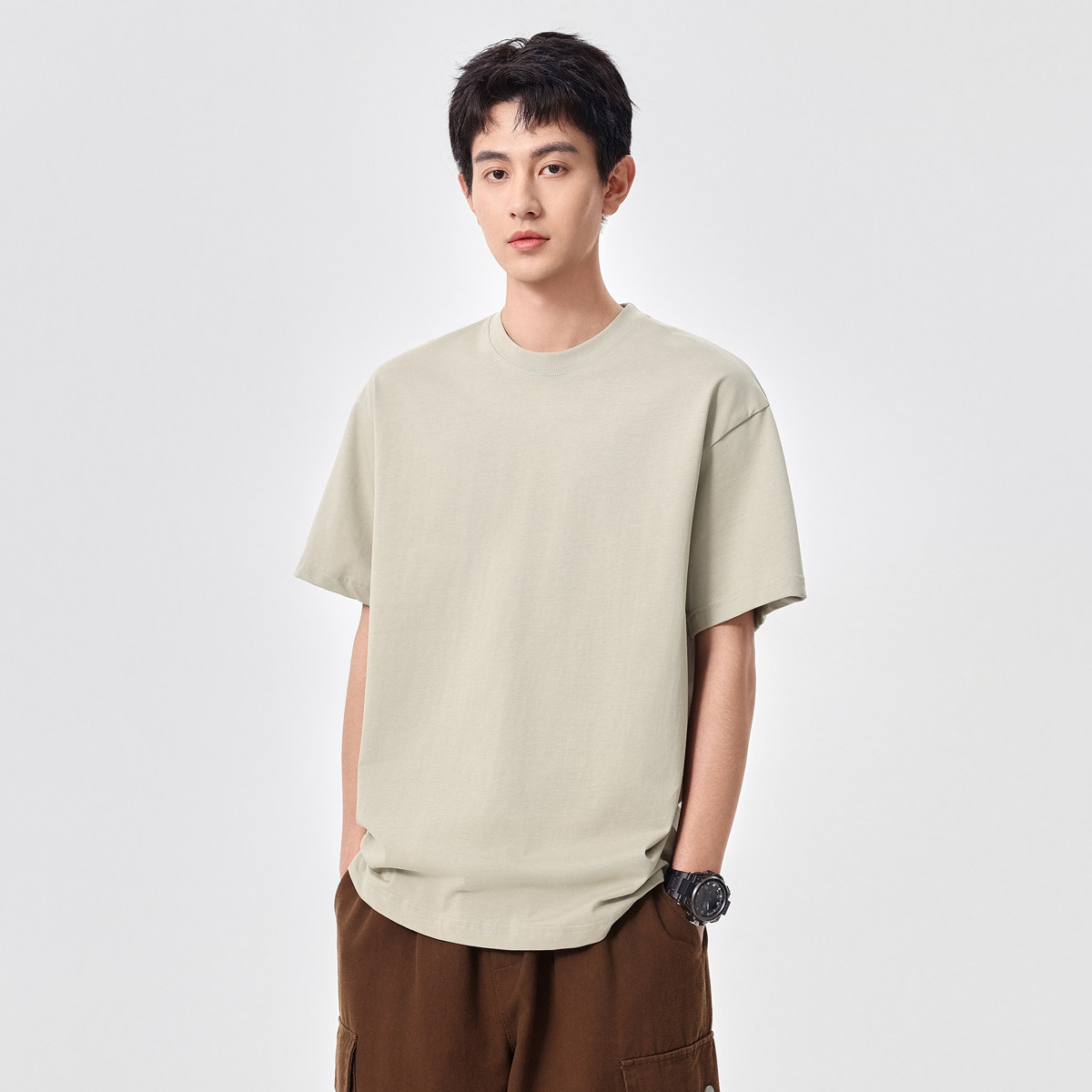 美式260g纯棉凉感短袖t恤男士圆领2025夏季薄款纯色三本针打底衫