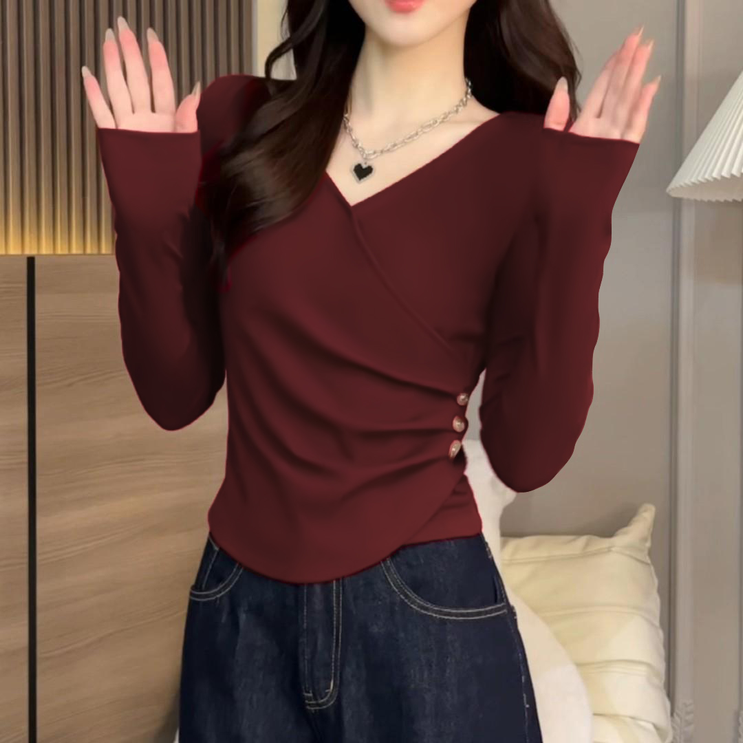 小香风V领纯色长袖T恤女春秋季新款修身显瘦打底衫收腰不规则上衣