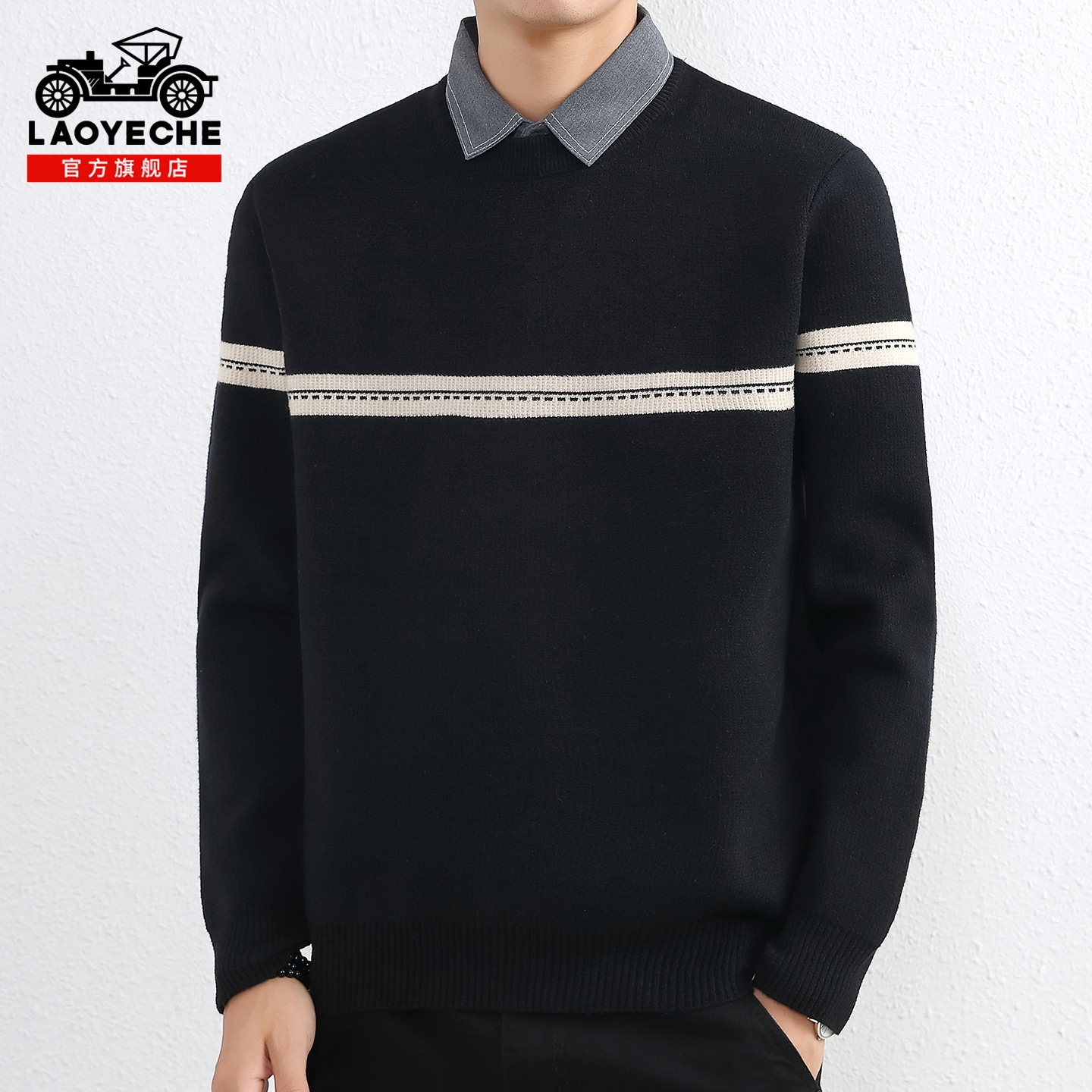 老爷车假两件毛衣男士衬衫领打底线衣秋冬季加绒保暖休闲针织衫男