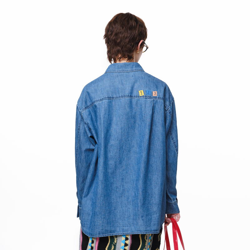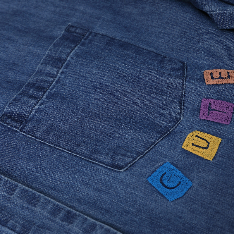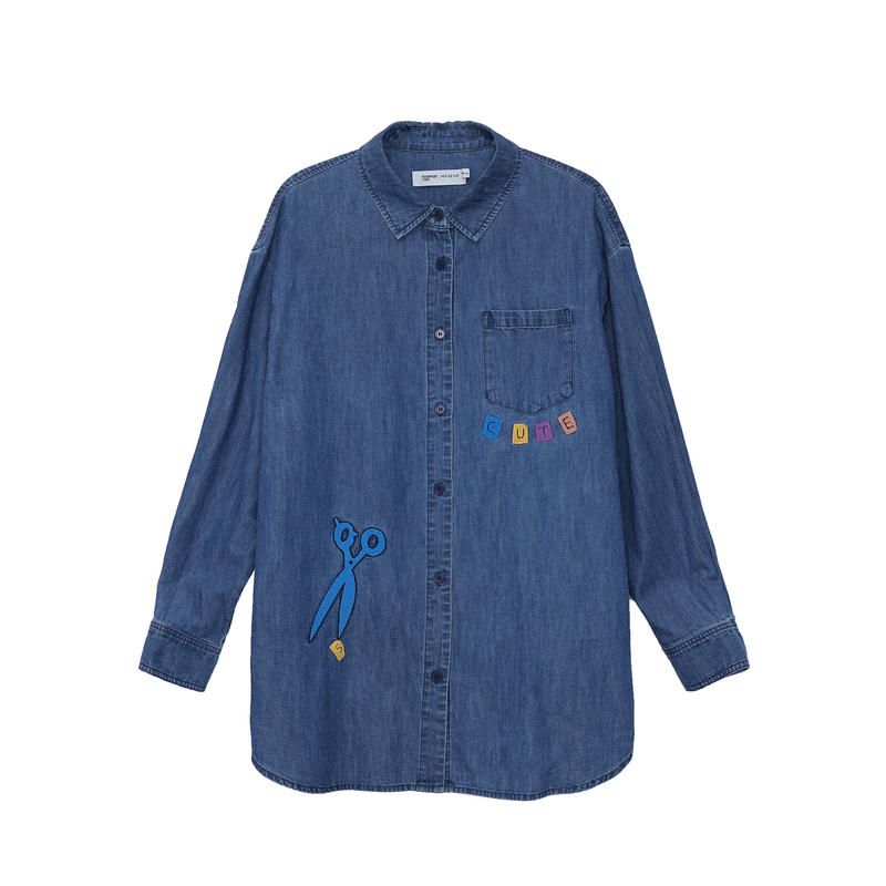 MOVEUP幻走2025秋季新款.FUN系列纯棉贴袋绣花牛仔中长款衬衫女