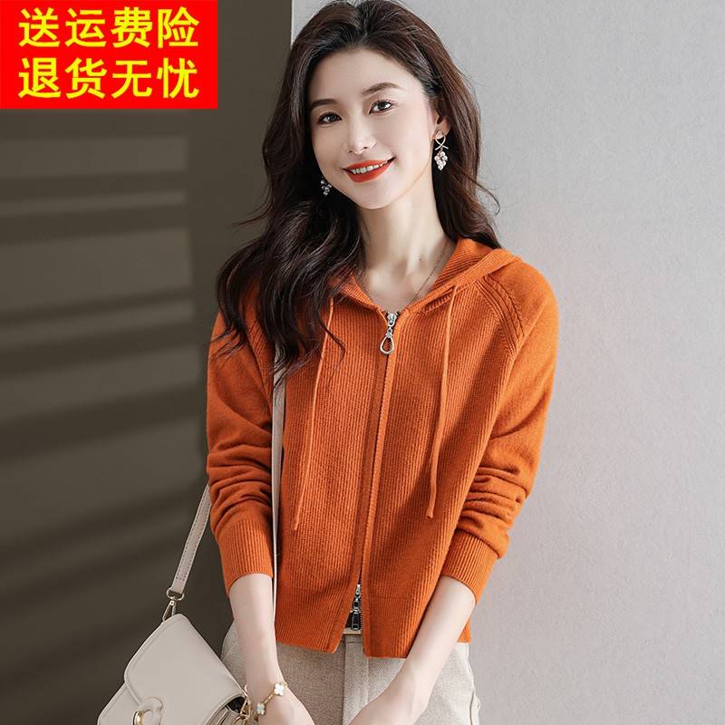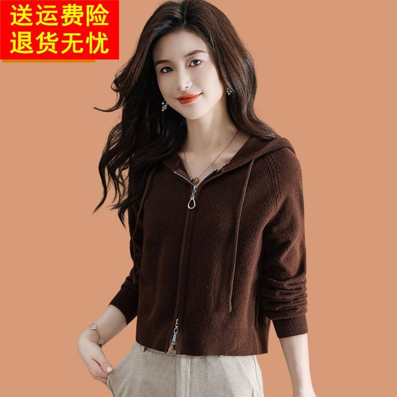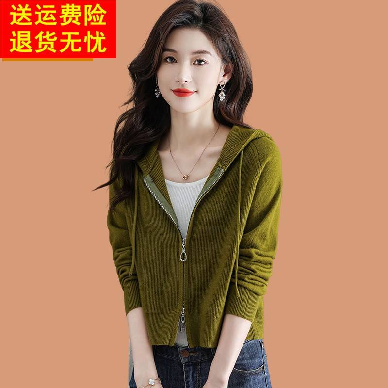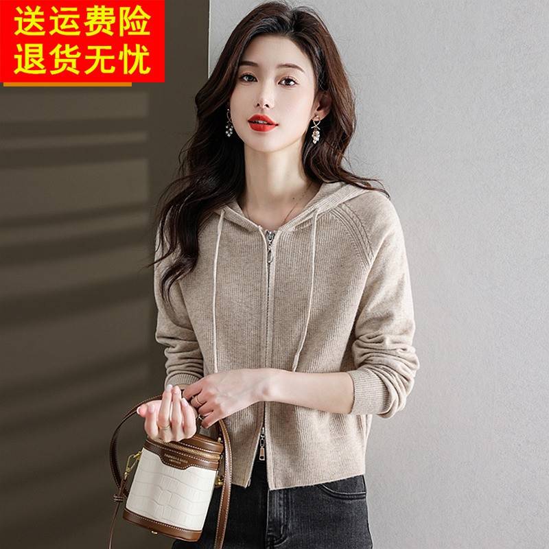 连帽针织衫女开衫羊毛披肩外搭高腰短款春秋小款毛衣外套休闲上衣