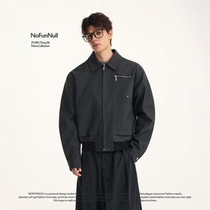 NOFUNNULL复古vintage斜纹哈灵顿翻领夹克男女短款多口袋拼接皮衣