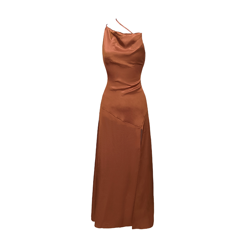 【夏季清仓 5折】 红棕色缎面材质吊带露背开叉长裙