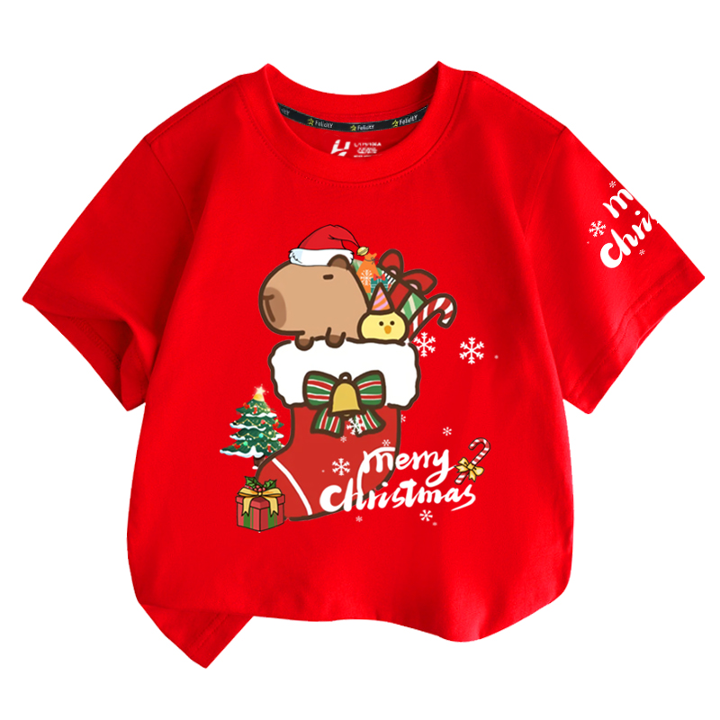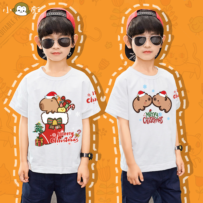 卡皮巴拉水豚君可爱萌系联名圣诞节短袖t恤衫男女儿童装学生半袖