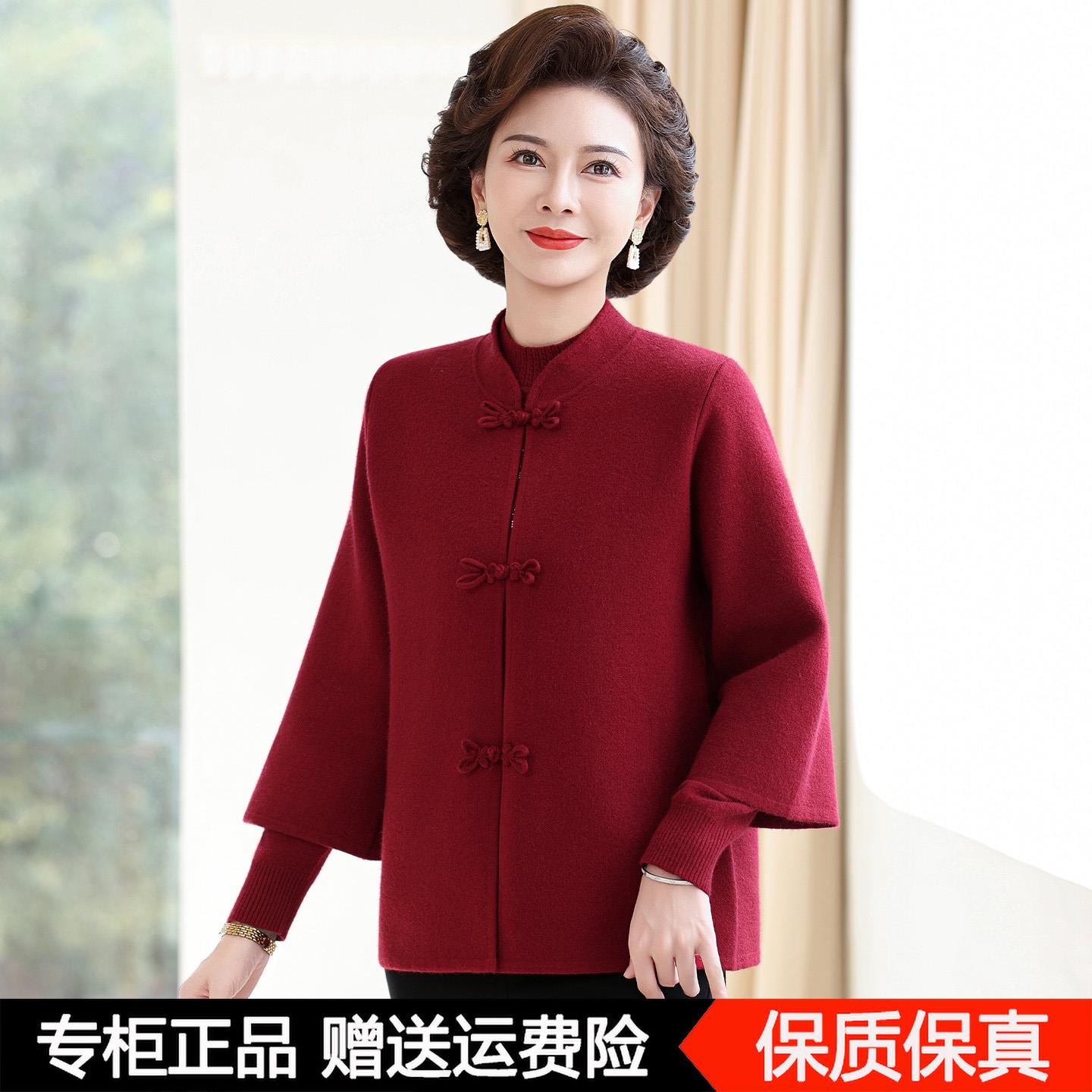 妈妈装国风毛衣两件套洋气上衣中老年女装秋冬新中式针织羊毛外套