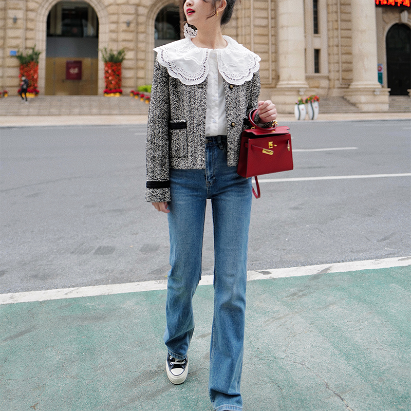 Ce*line风法式高腰修身直筒牛仔裤女士春季弹力显瘦做旧水洗长裤