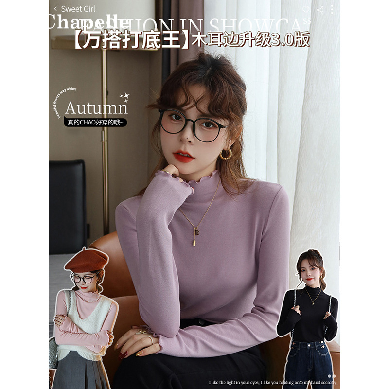 拉夏贝尔紫色半高领长袖T恤女秋季木耳边打底衫小香风内搭上衣