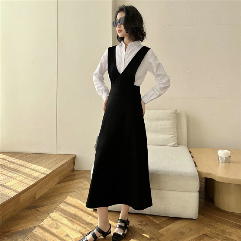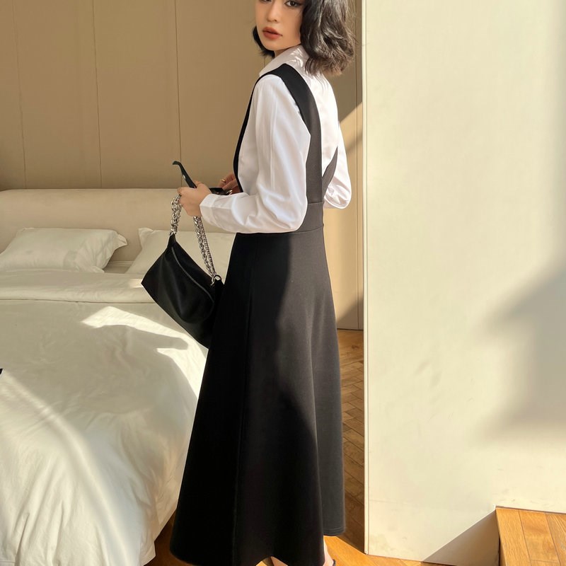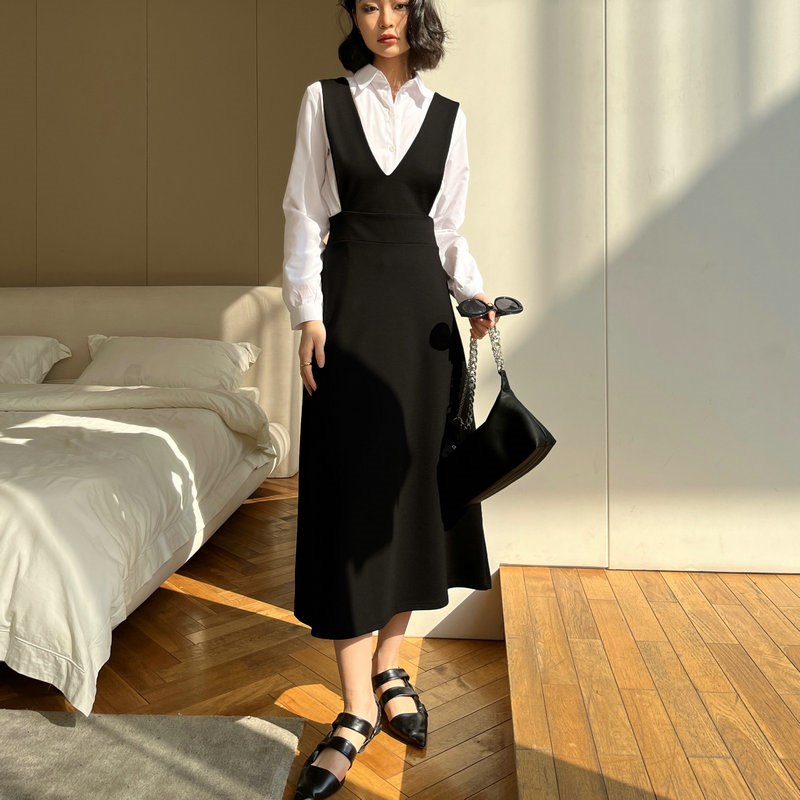 春款黑色罗马棉V领A字收腰背心裙中长款连衣裙背带裙女装无袖显瘦