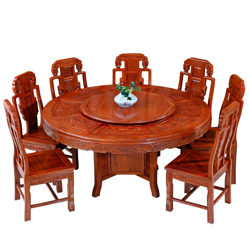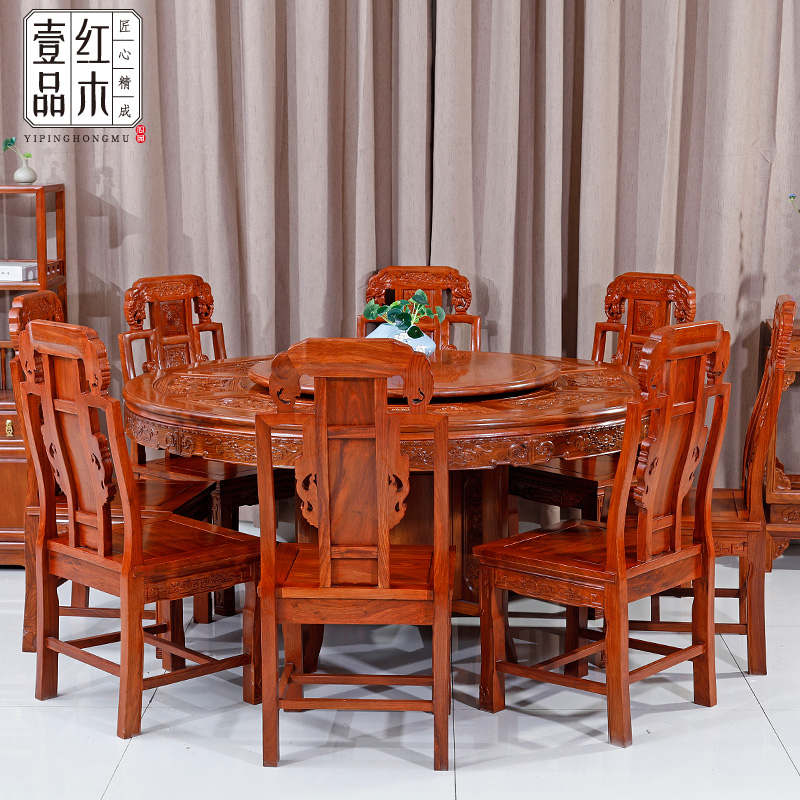 红木刺猬紫檀圆形家用餐桌带转盘黄花梨桌椅8人10人中式吃饭桌