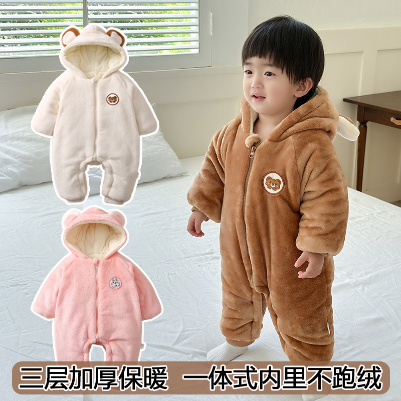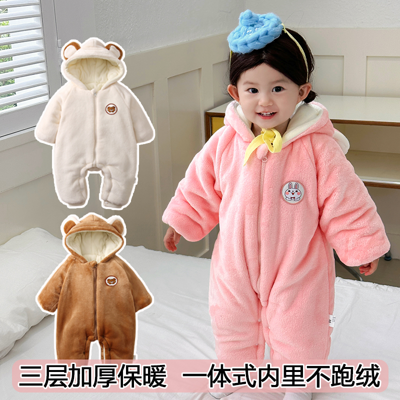 婴儿法兰绒连体衣新生儿童加厚保暖冬季爬服男女童宝宝外出抱衣服