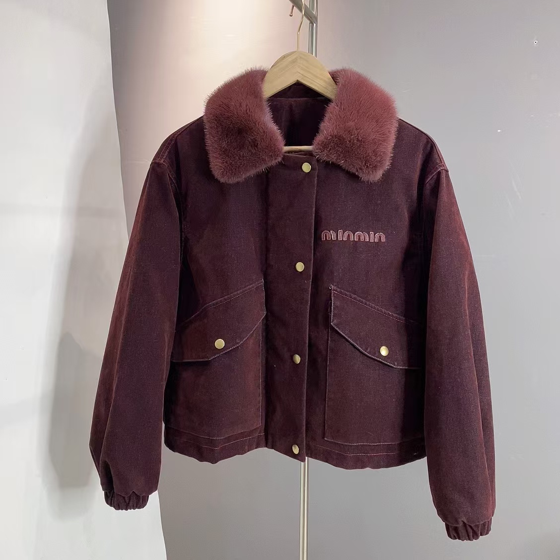 ban2025冬新款水貂毛领牛仔羽绒服女短款显瘦鹅绒皮草外套202