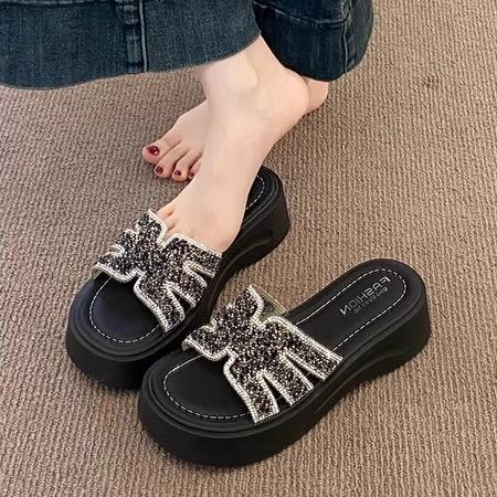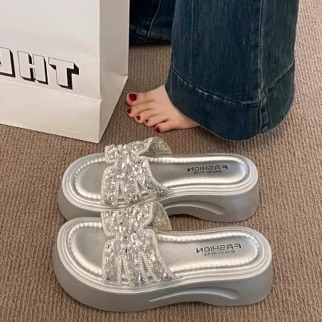 香港真皮银色一字拖鞋女夏外穿2025新款厚底增高水钻浅口防滑凉拖