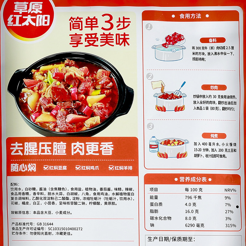 草原红太阳红焖牛羊肉调料160g家用闷炖红烧肉秘制炖牛羊排酱料包