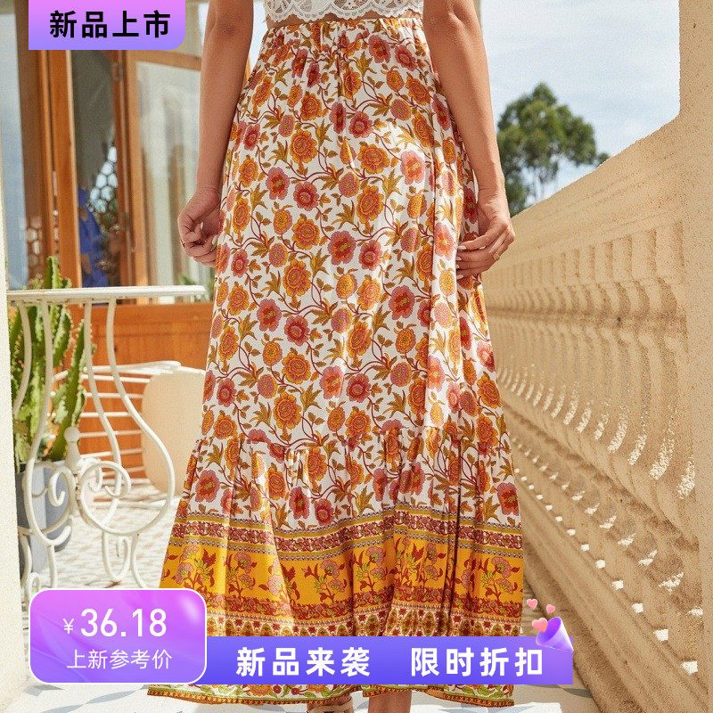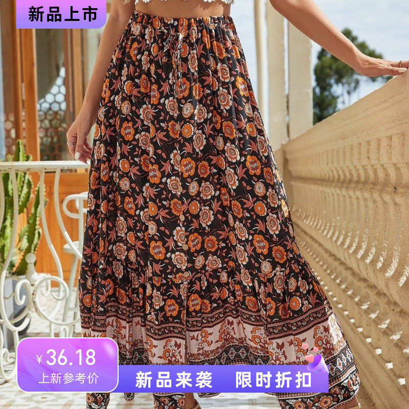 波西米亚度假民族风印花镂空系带松紧大摆a字长裙棉绸沙滩半身裙