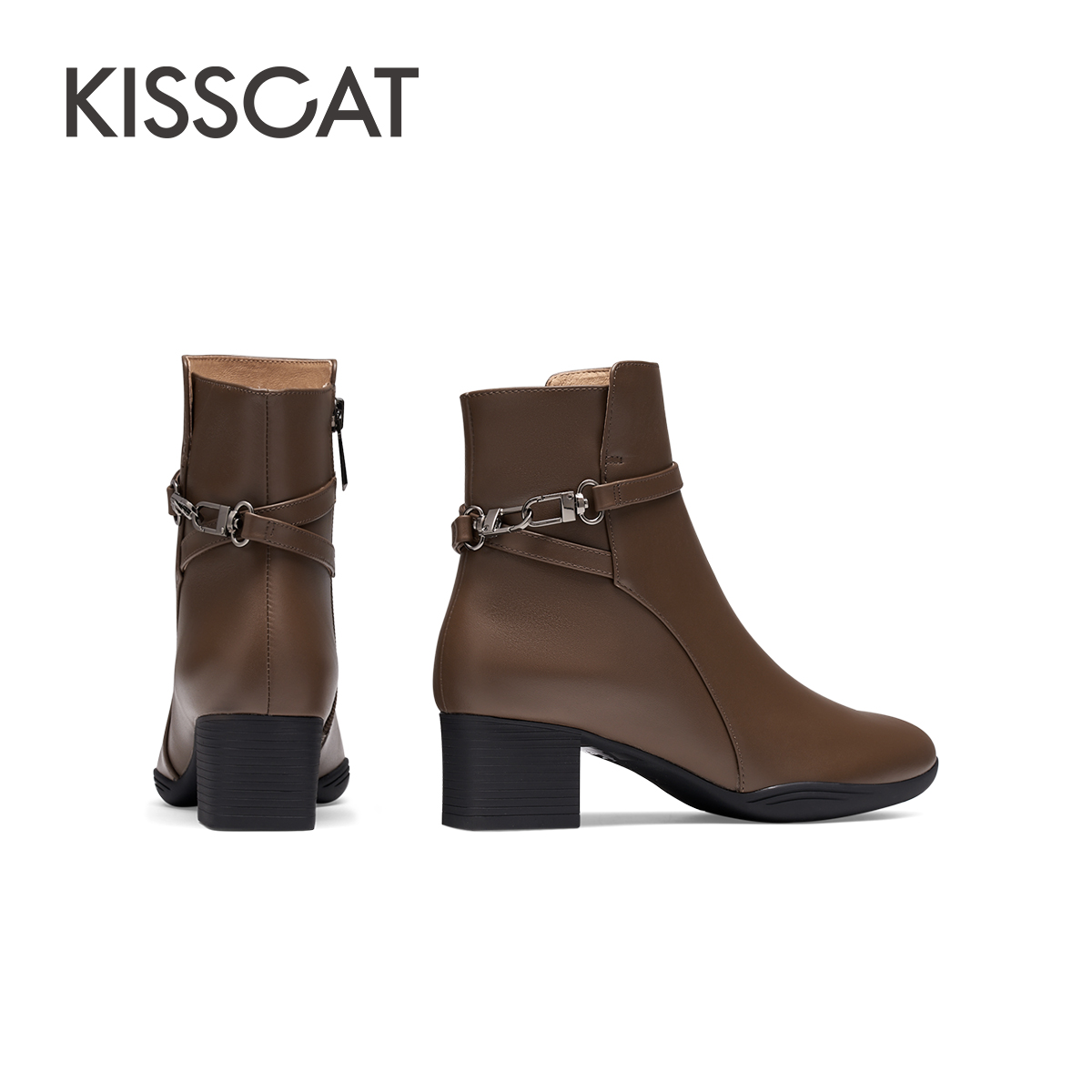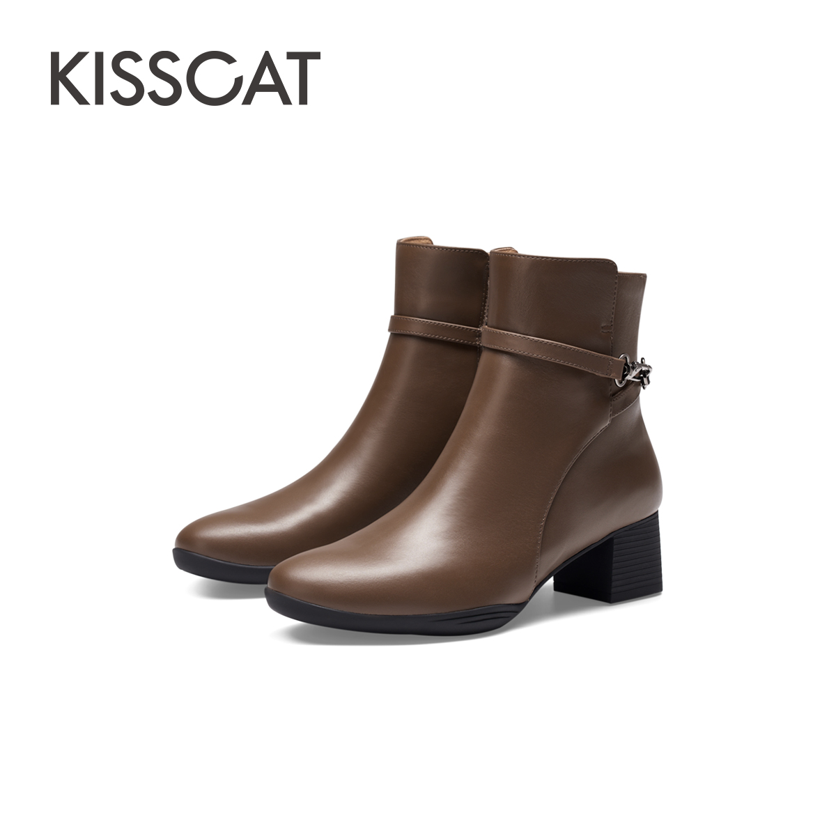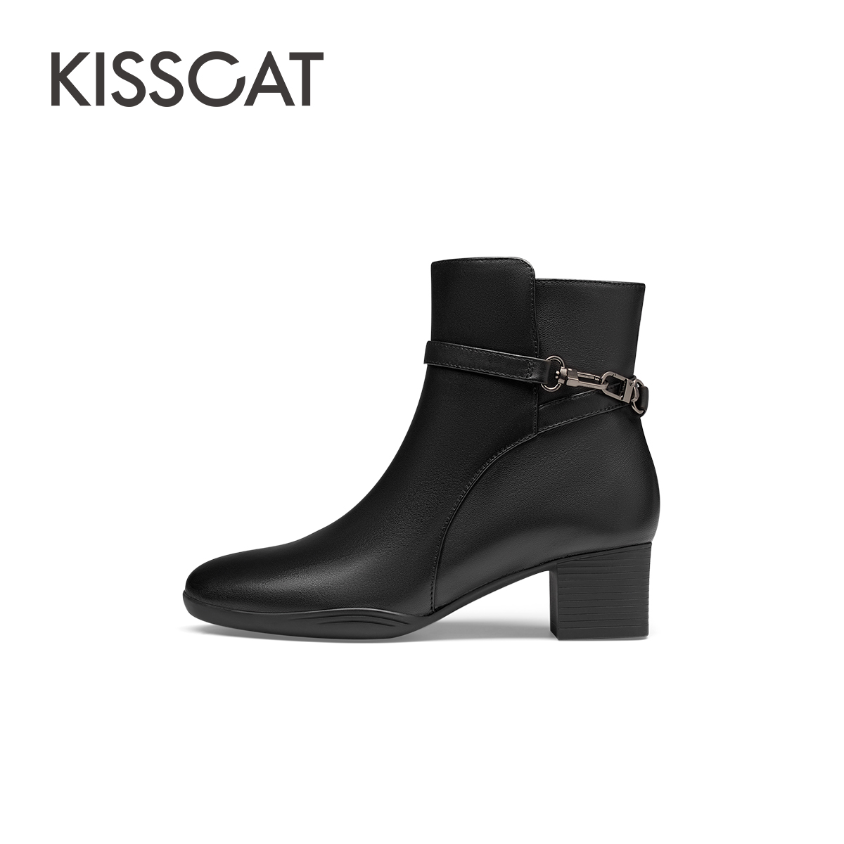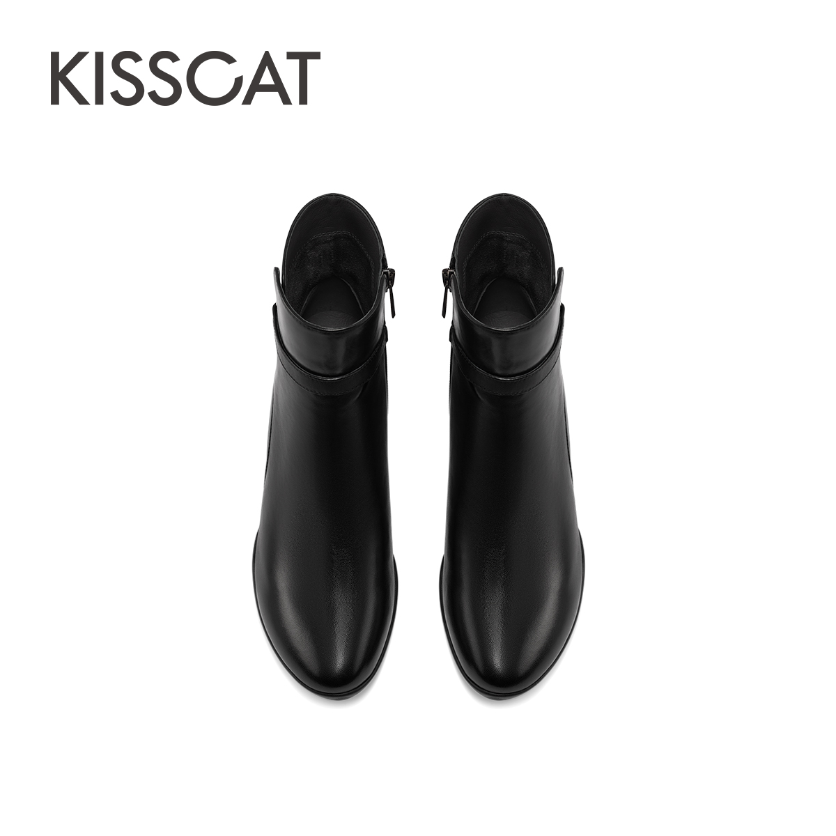 KISSCAT接吻猫新款通勤真皮短靴时尚粗跟法式黑色时装靴女