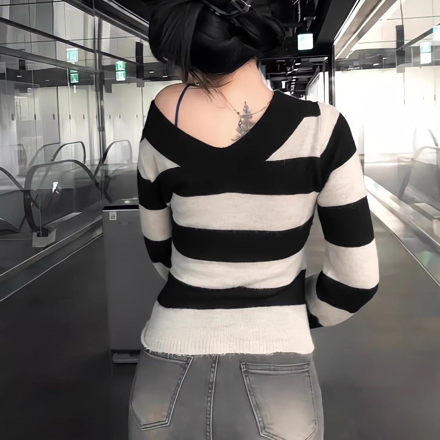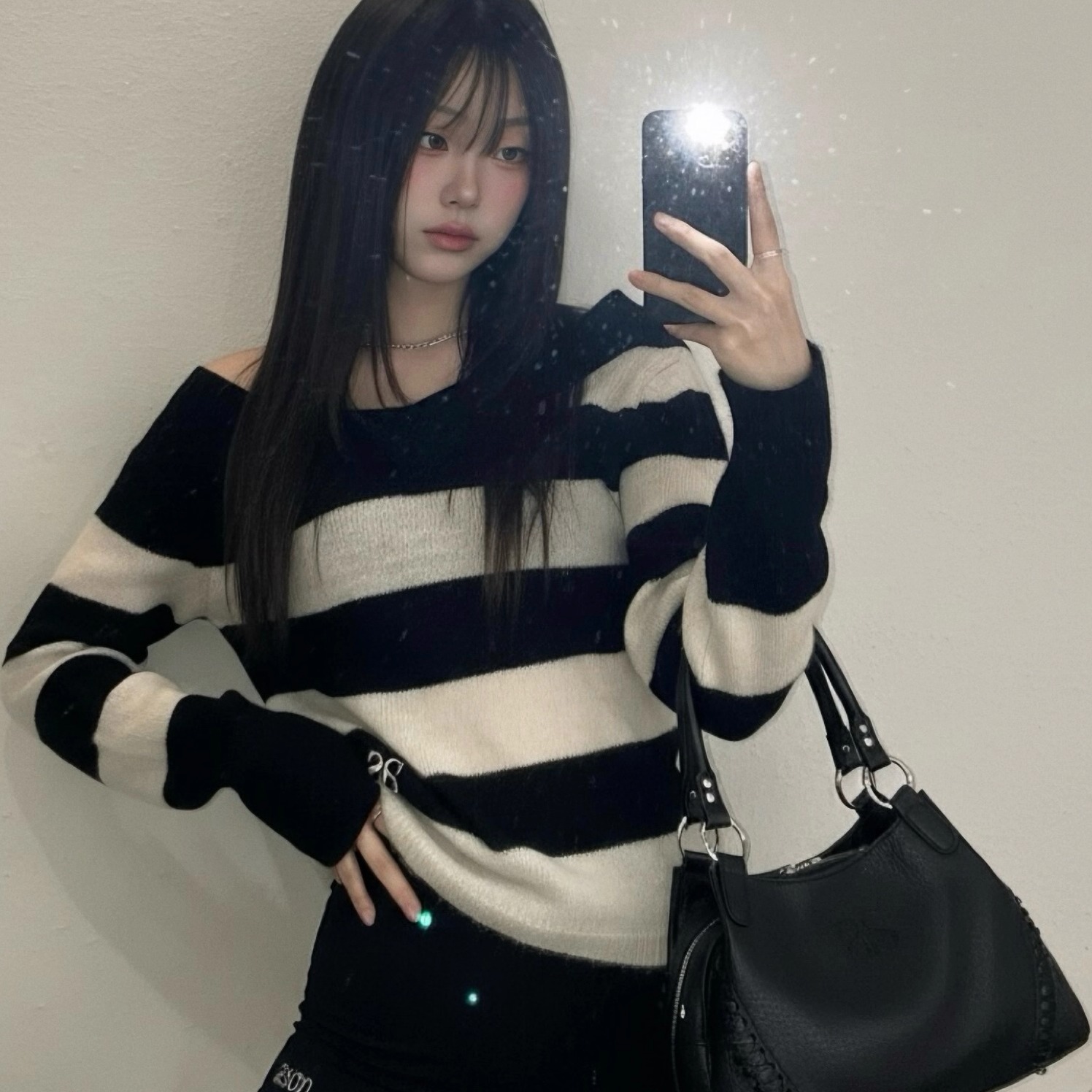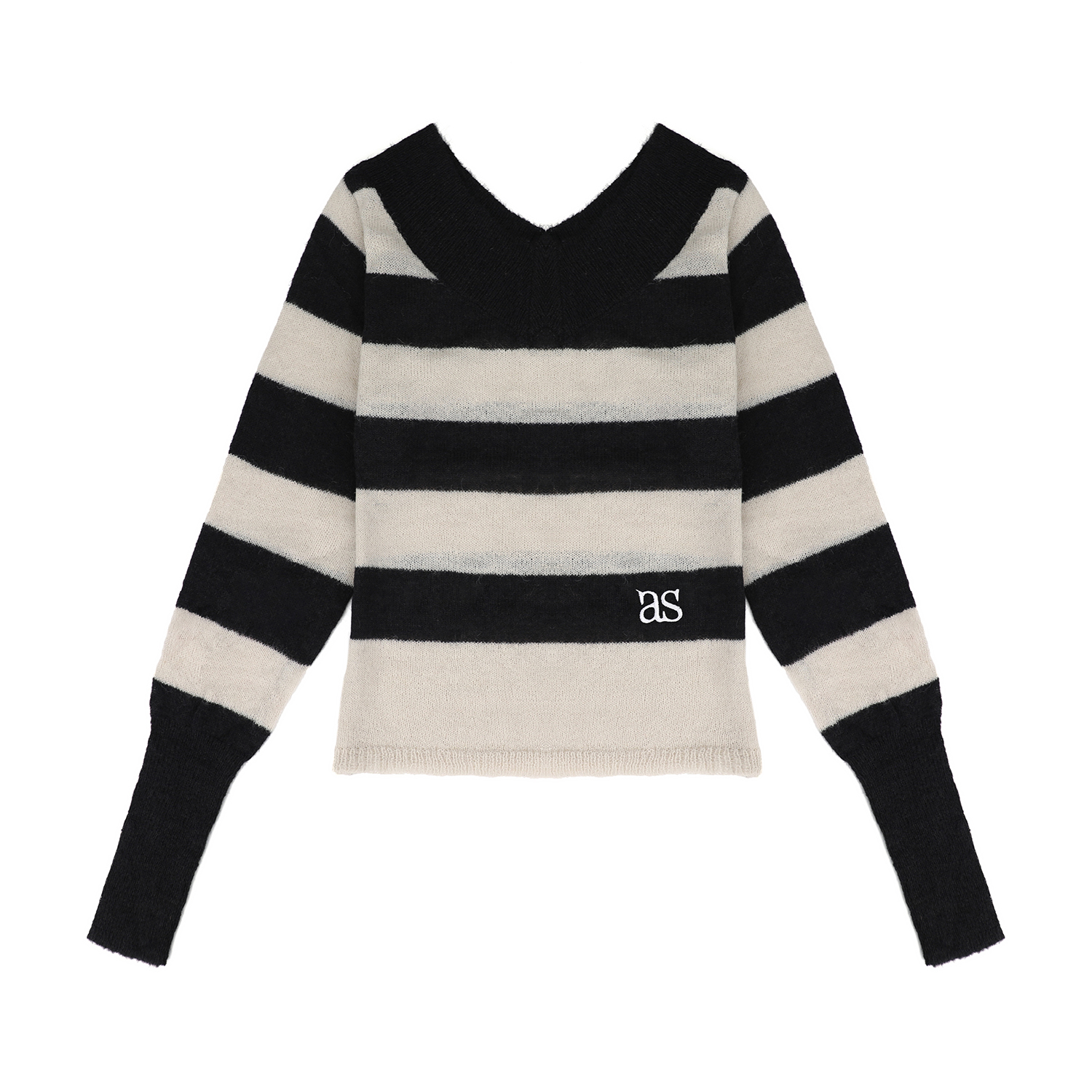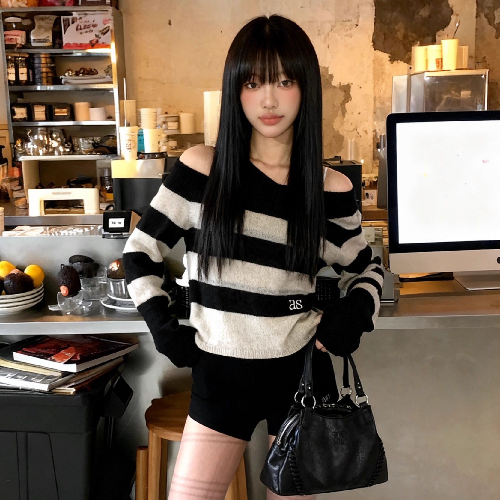 REOY Stu”韩版ason字母as刺绣露肩款长袖修身条纹打底针织衫毛衣