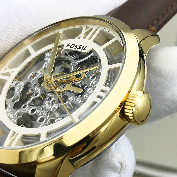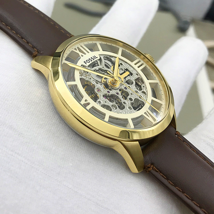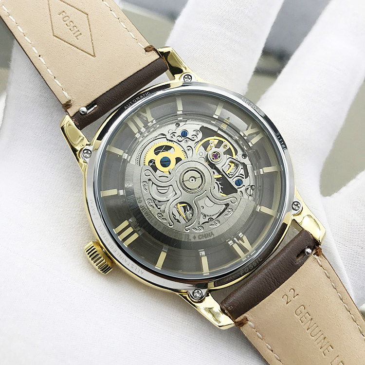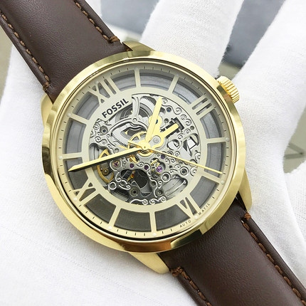 FOSSIL手表真皮表带金色镂空自动机械表时尚潮流防水男表ME3043