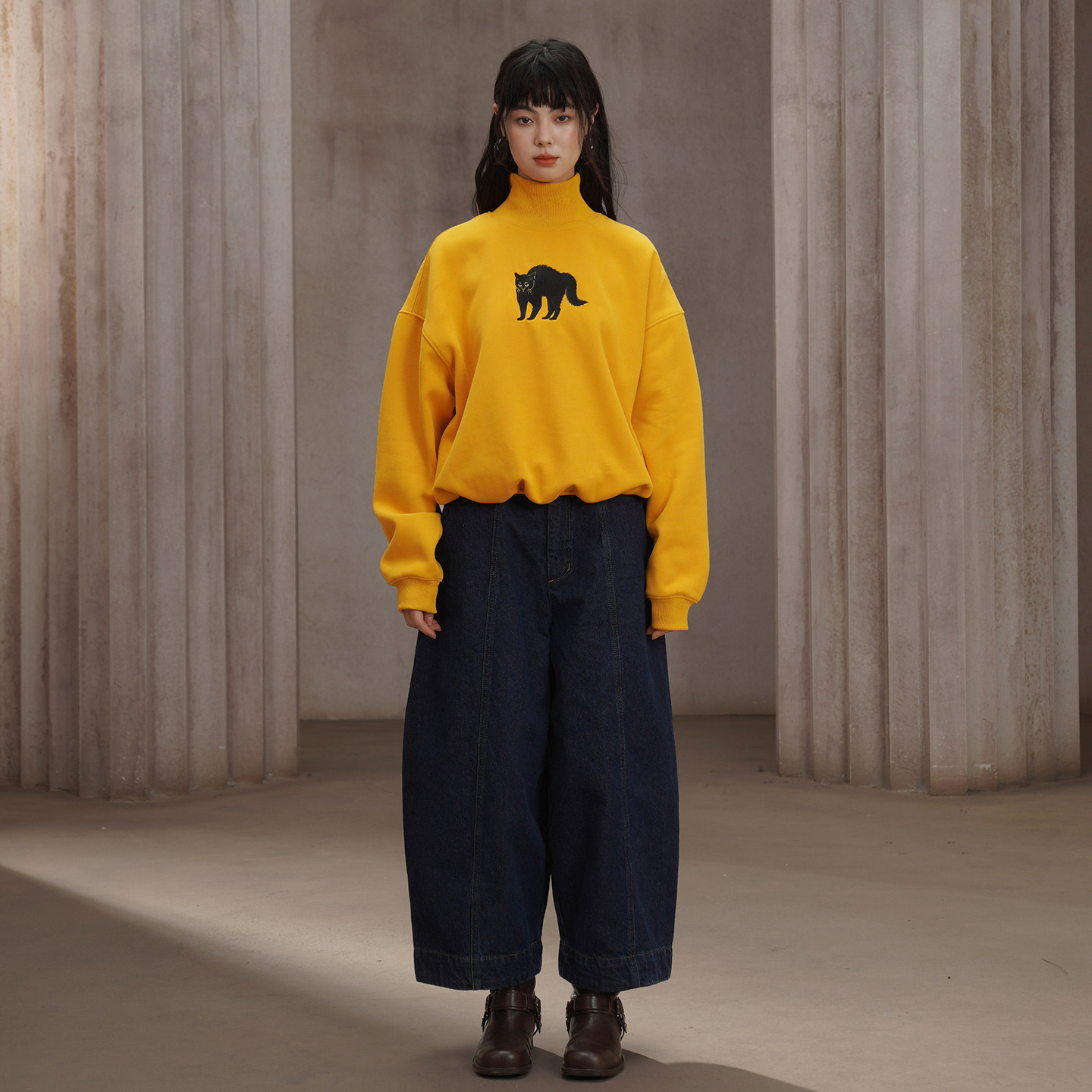 咖沫原创复古女装黑猫少女刺绣卫衣街头穿搭太阳黄加绒半高领上衣