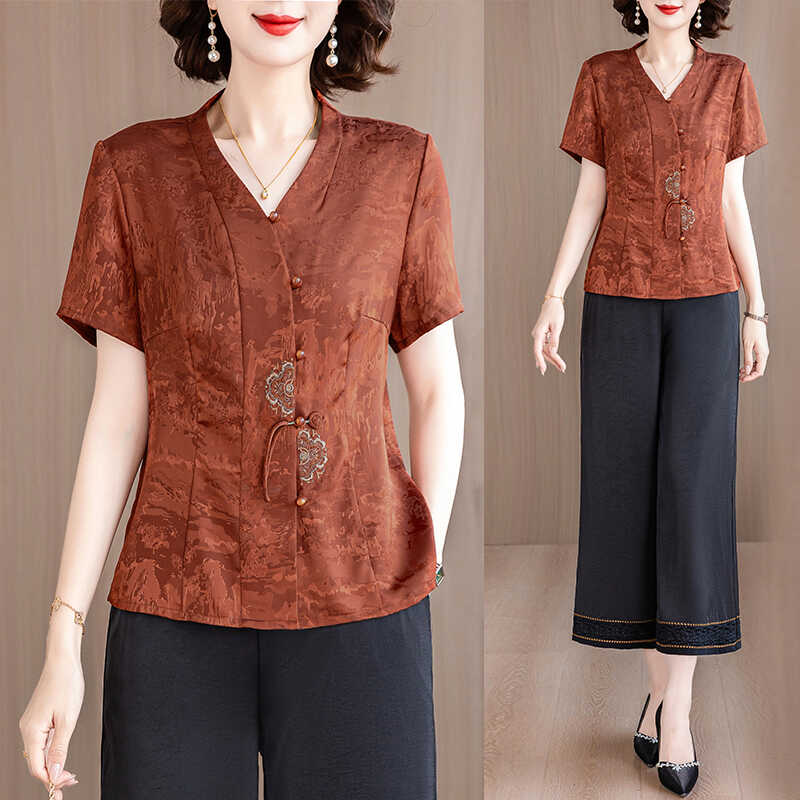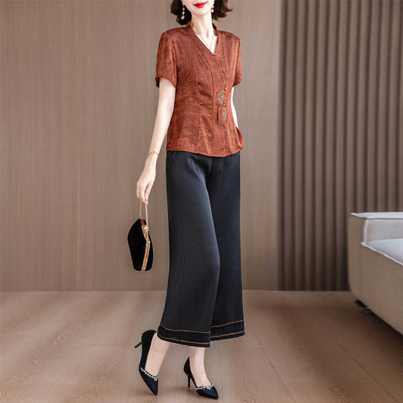 品质妈妈中年夏装国风香云纱套装新款时尚中式桑蚕丝上衣t恤小衫