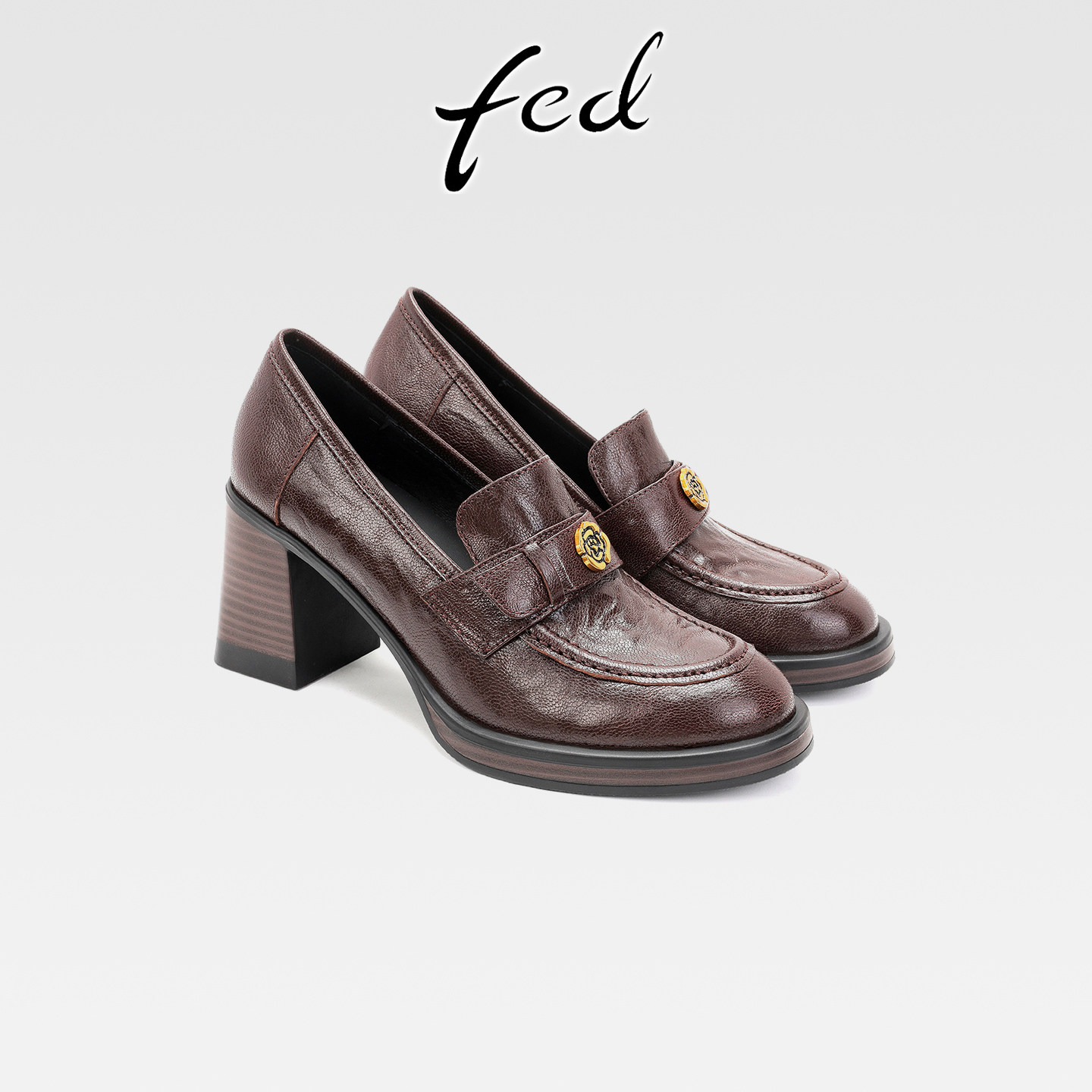 fed英伦风真皮粗跟山茶花乐福鞋女复古小皮鞋一脚蹬圆头深口单鞋