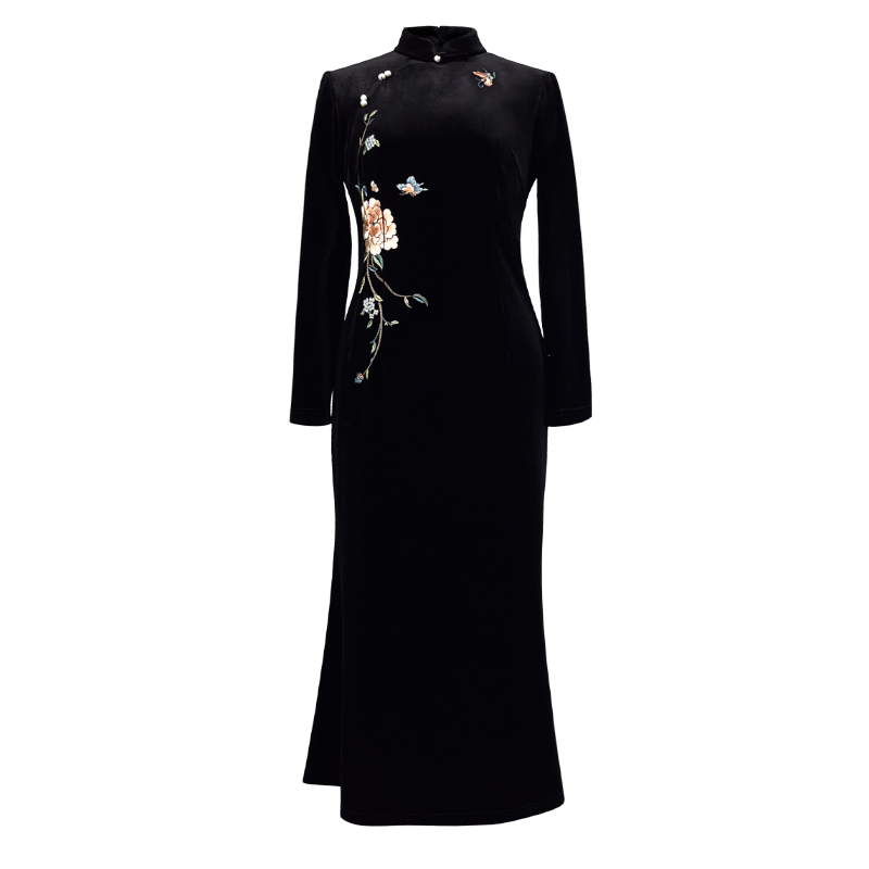 浒城古娘春季新款女装刺绣丝绒气质中长款新中式旗袍连衣裙女春秋