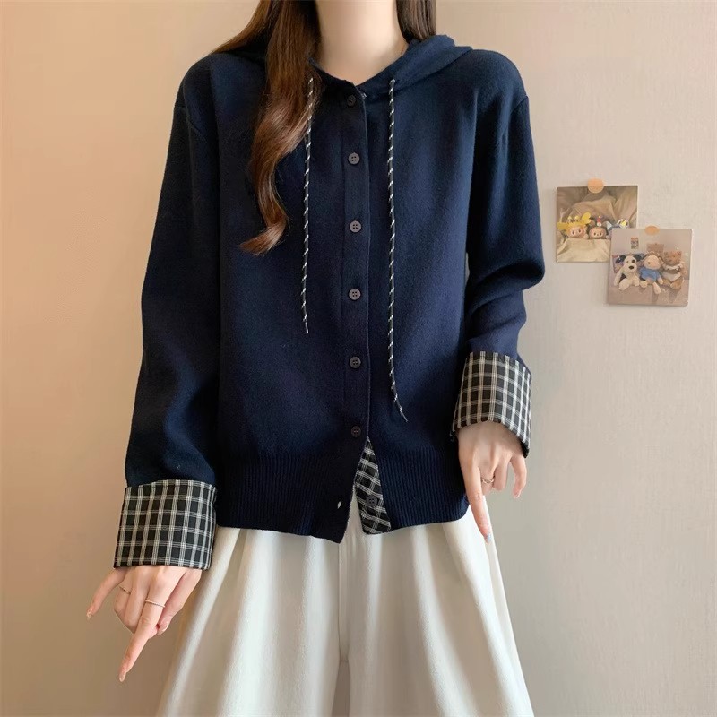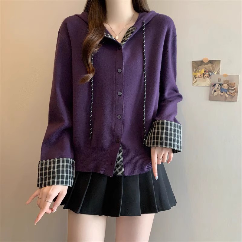 韩系慵懒风紫色连帽毛衣宽松外套女秋冬高级感中长款针织开衫上衣