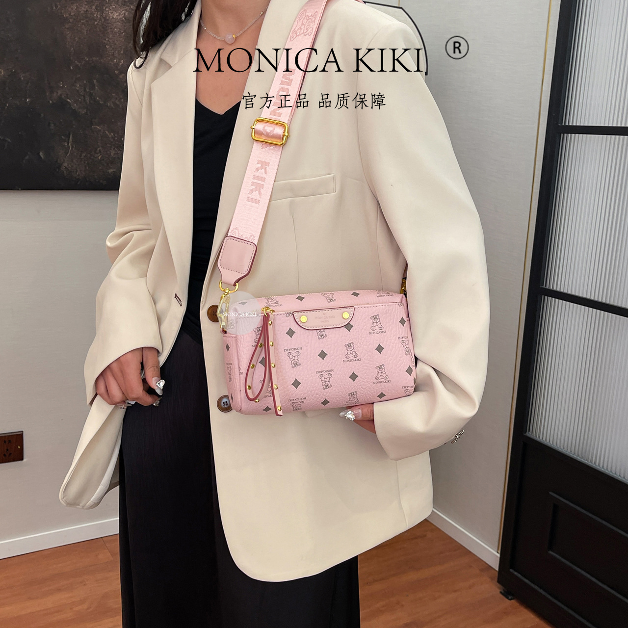 莫妮卡奇奇棕色小熊印花时尚小方包女2025新款宽肩带单肩斜挎网红