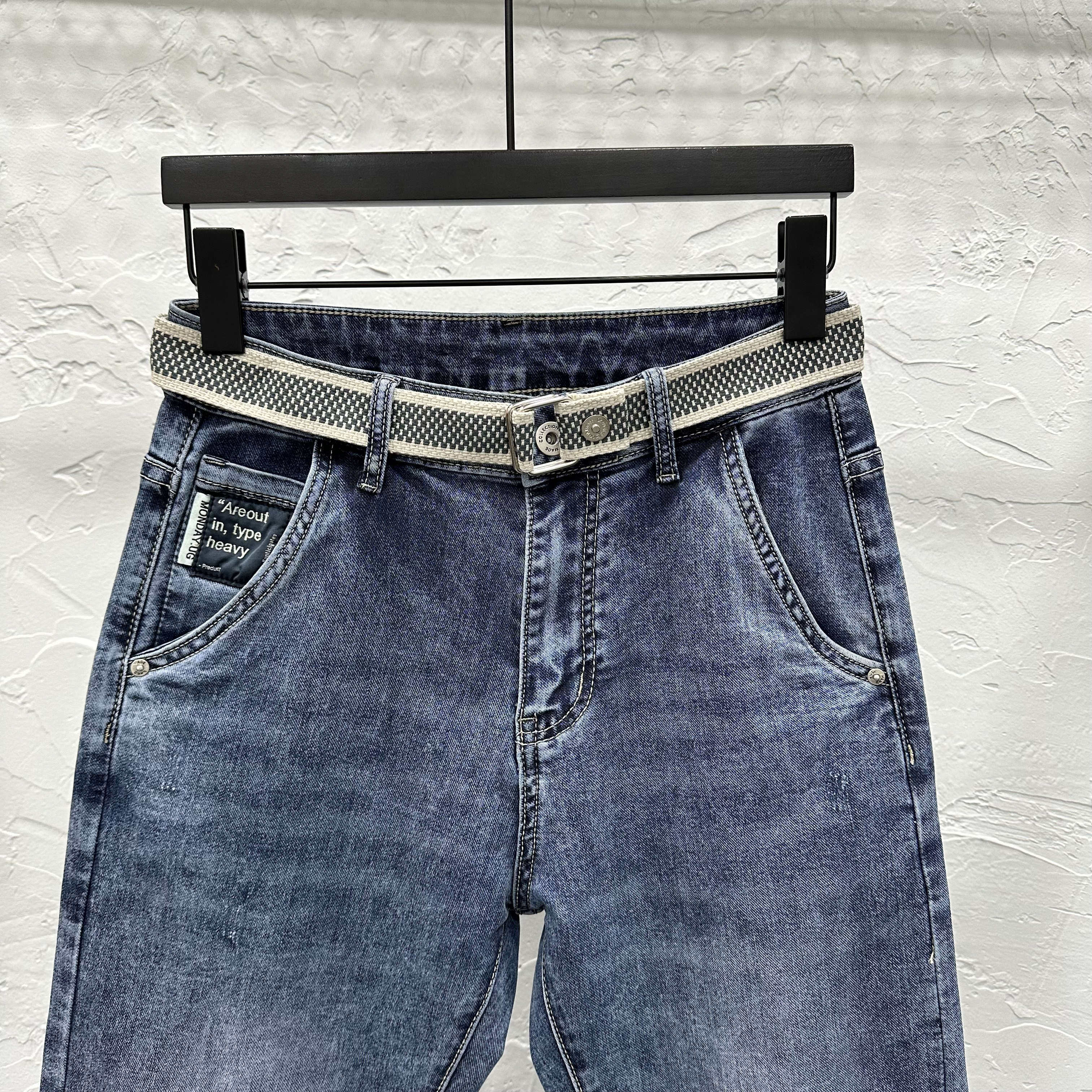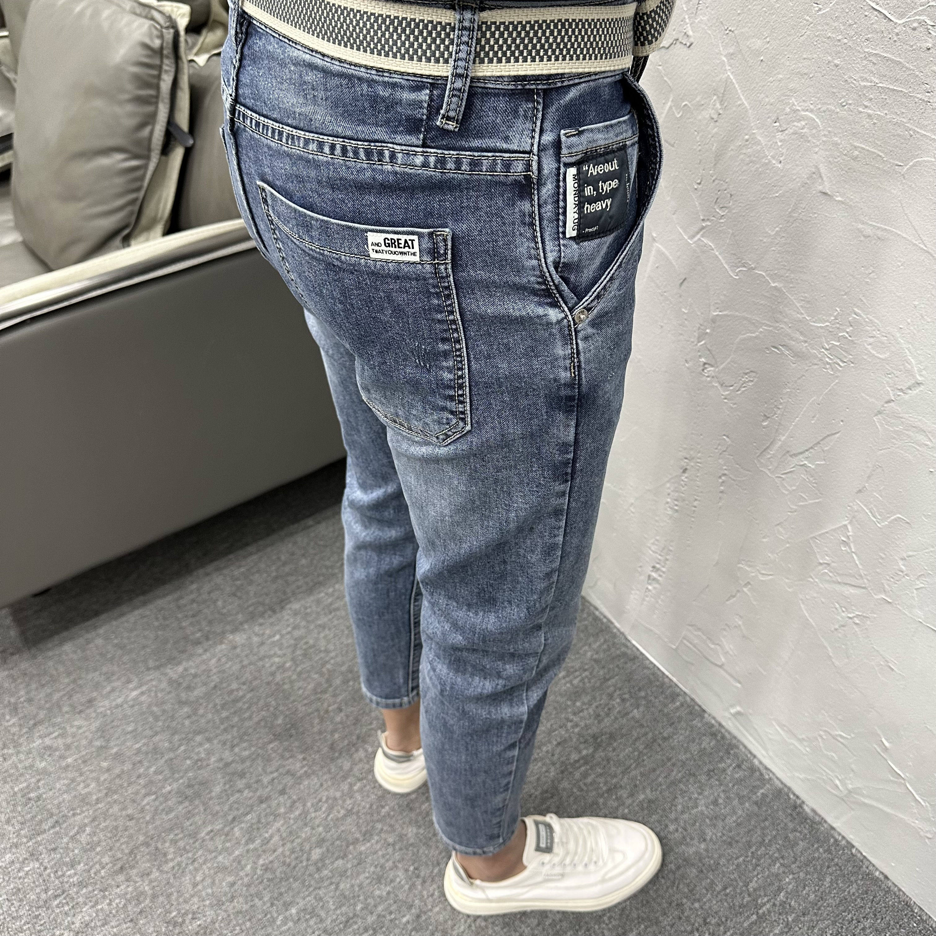 斜插口袋浅蓝水洗微跨修身小脚九分牛仔裤春夏男潮流休闲弹力薄款